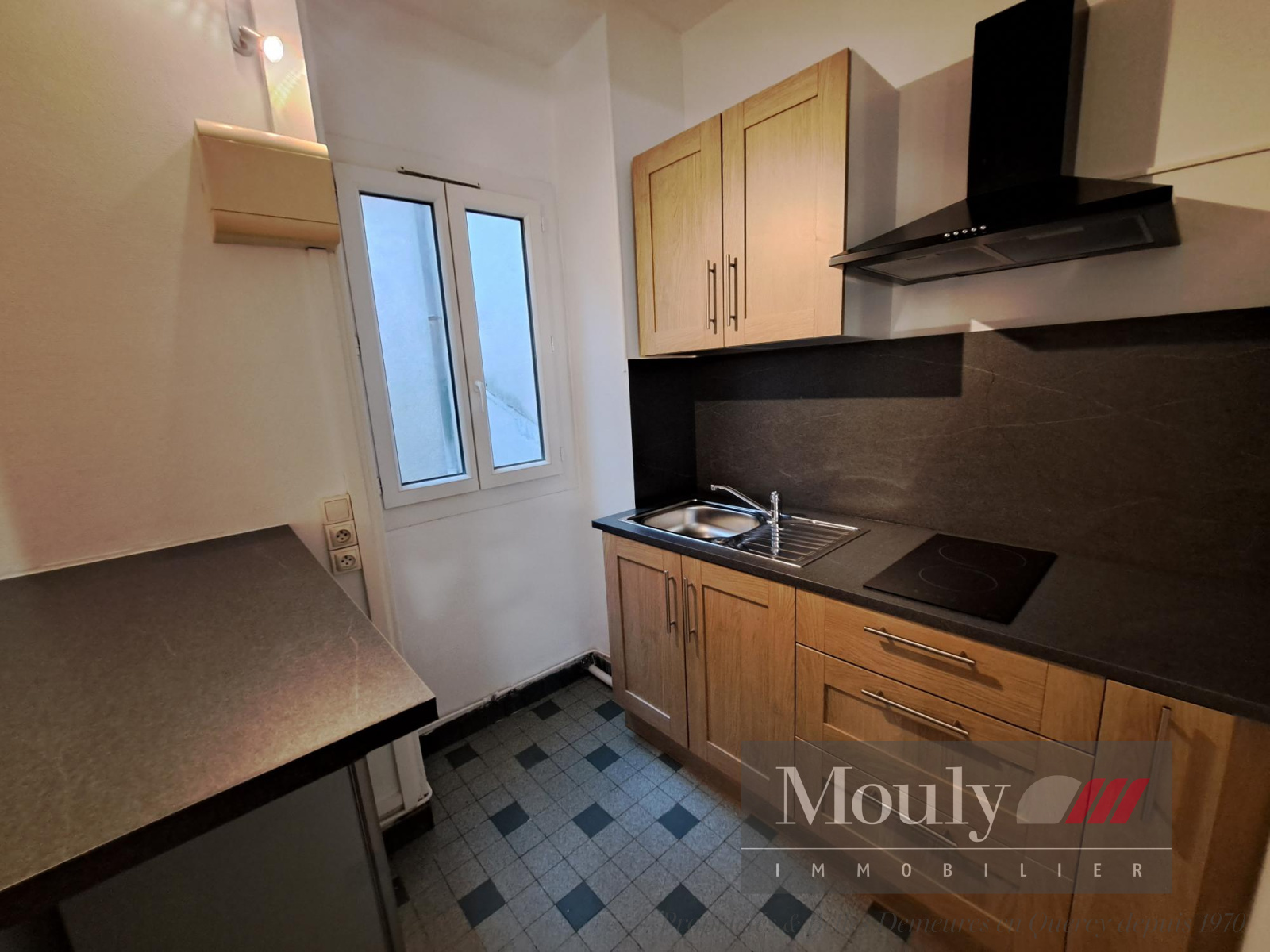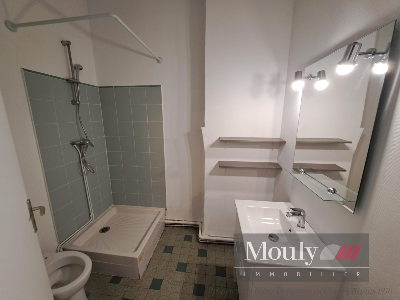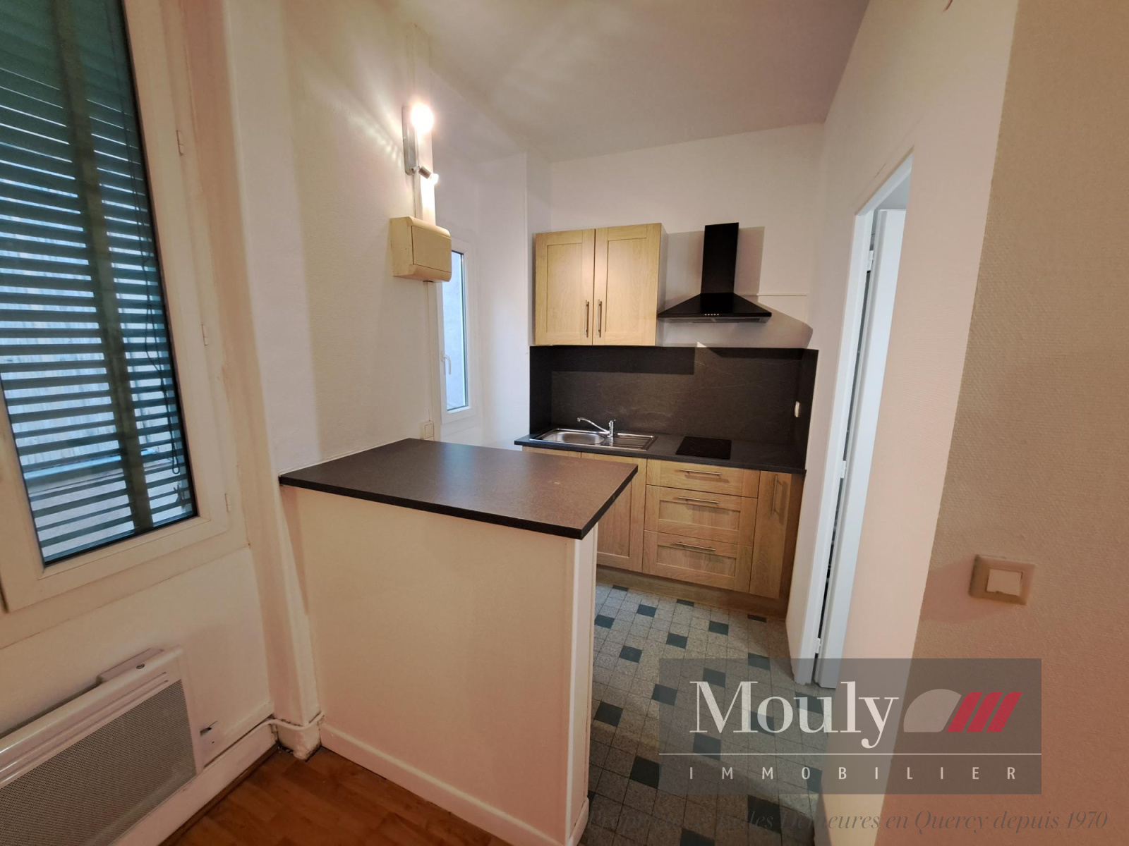 Situé au 2ème étage et comprenant : une pièce de vie avec cheminée décorative donnant sur coin cuisine équipée neuve (1 meuble haut -meubles bas - plaque cuisson et hotte, frigo et bar) - salle d'eau et wc sanibroyeur
