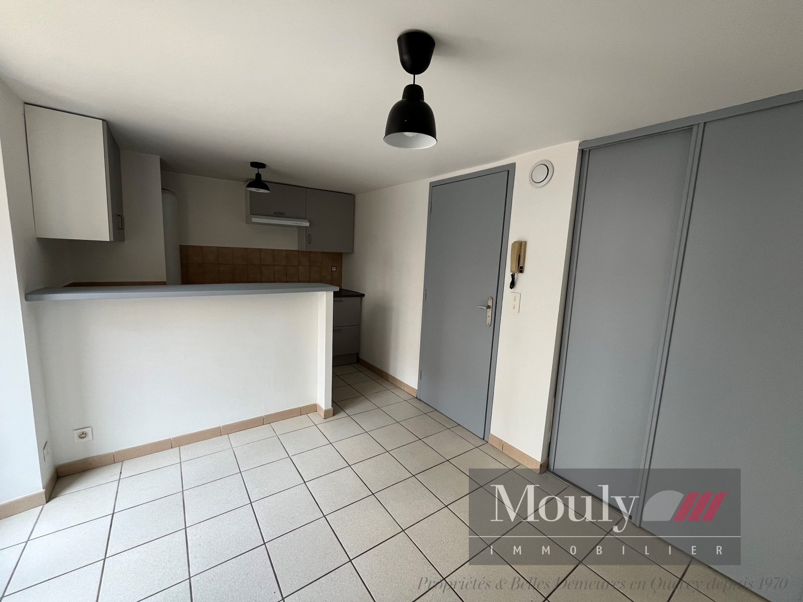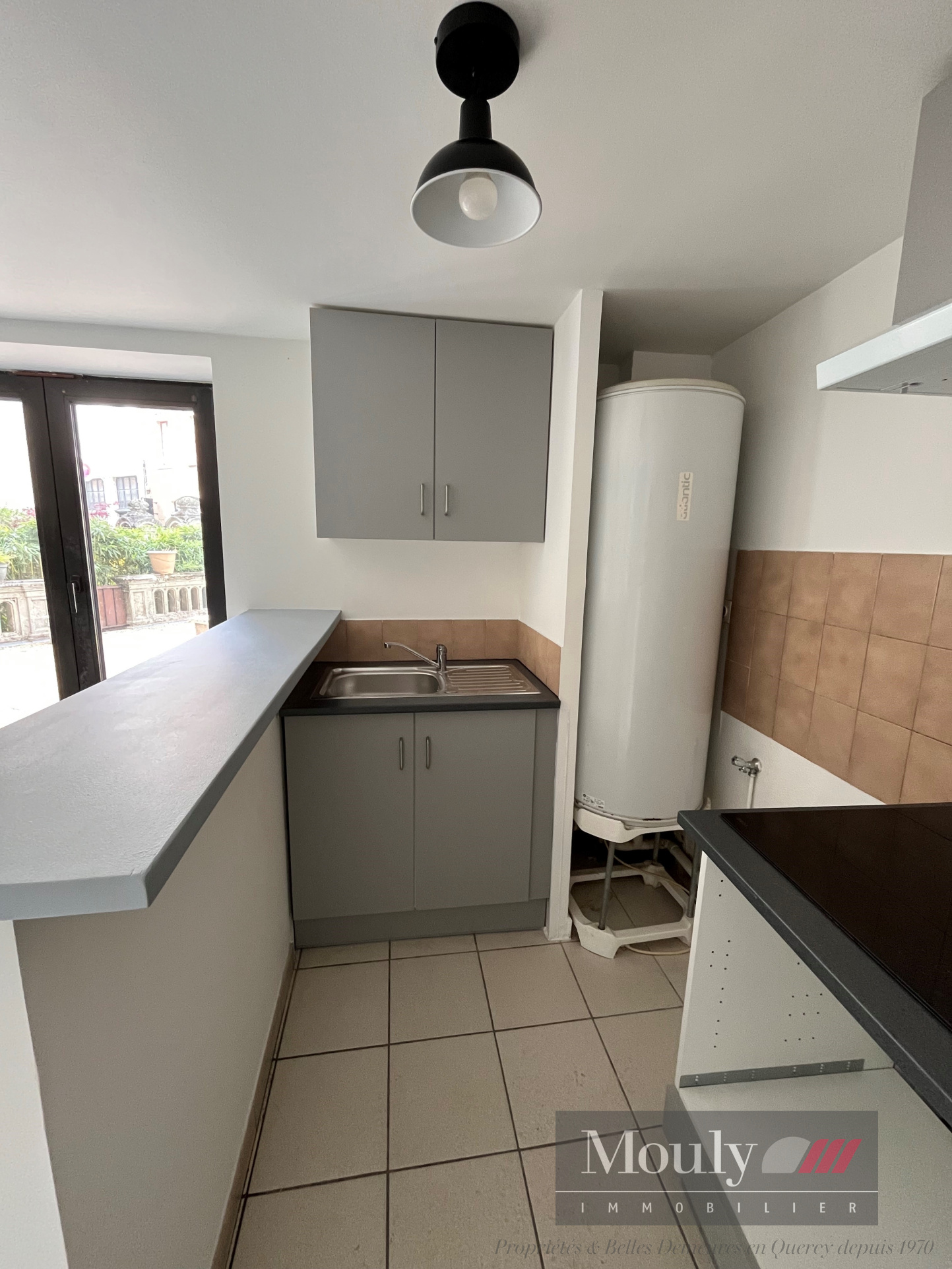 Composé d'une entrée sur pièce de vie avec accès terrasse, cuisine refaite à neuf aménagée et équipée (plaque, hotte, évier, élements hauts et bas), salle d'eau avec WC.