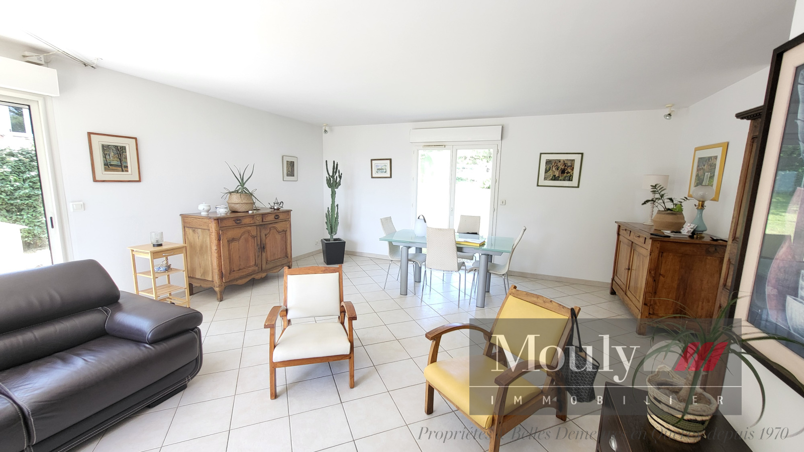 Cuisine équipée indépendante, salon salle à manger avec grande baie vitrée lumineuse.
