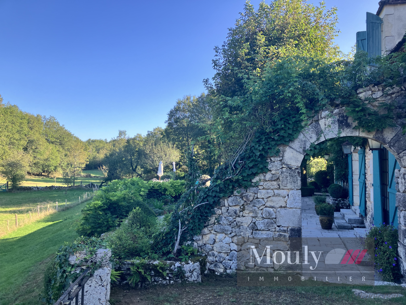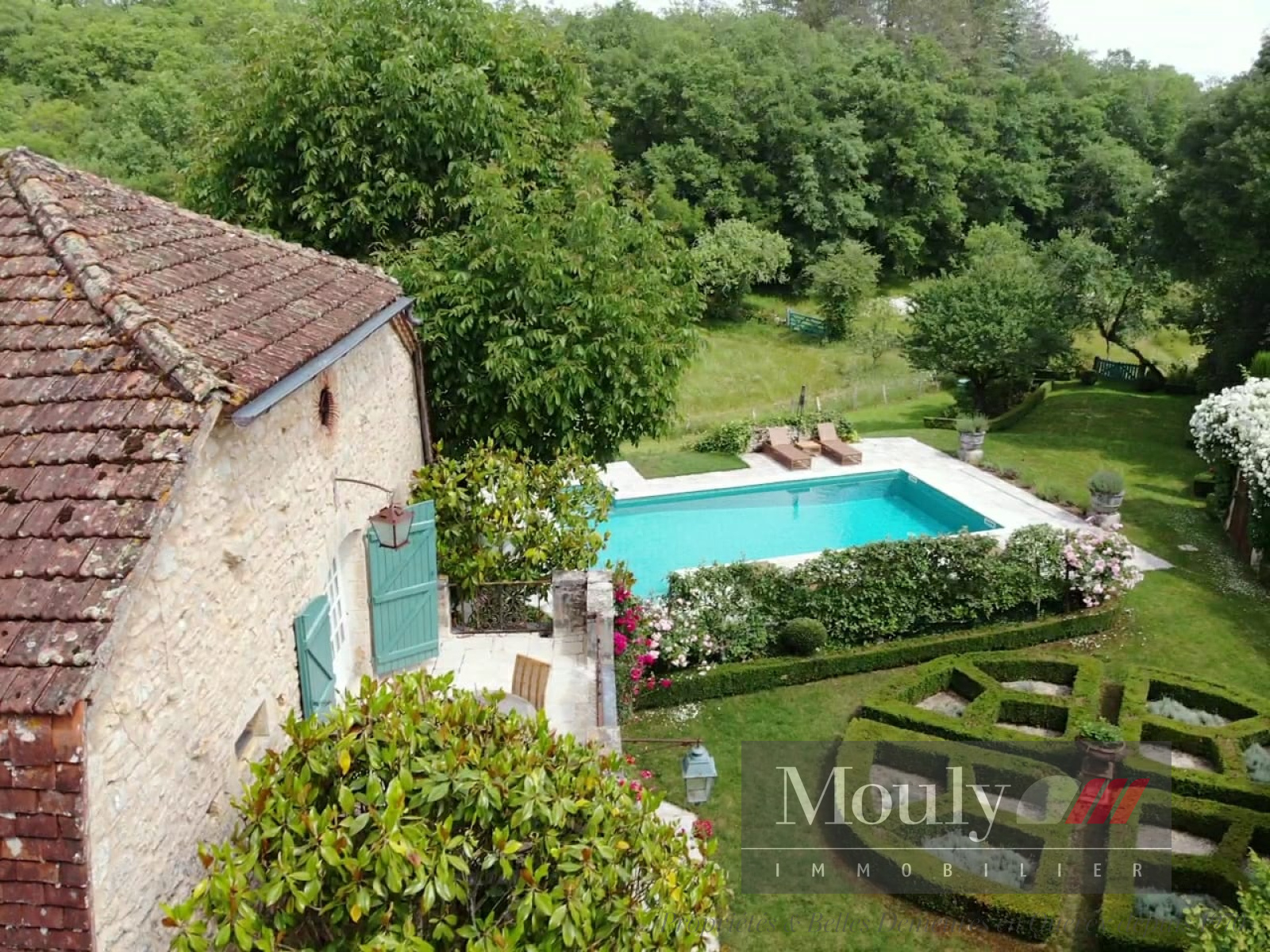 Une piscine apporte sa note d'eau au centre de ce paysage. La propriété s'étend sur plusieurs hectares délimités par des murs de pierre sèche et des haies champêtres. Elle suit les courbes du terrain et offre des vues sur le paysage ouvert du causse et les vallées alentour.