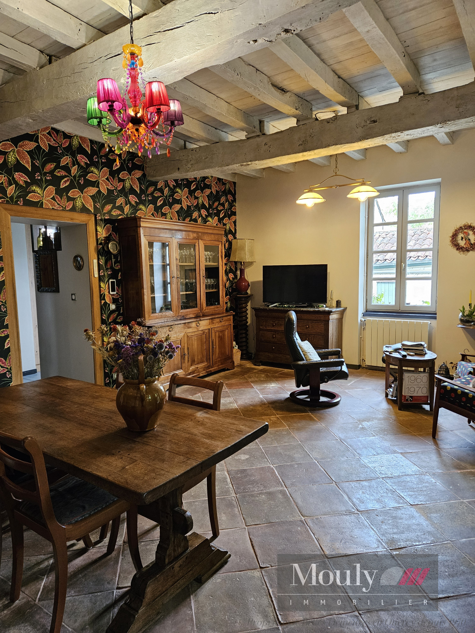 Salon de 29m² avec cheminée et poêle à bois, salle à manger ouverte sur le jardin, bureau accolé à une jolie verrière, cuisine aménagée et équipée.