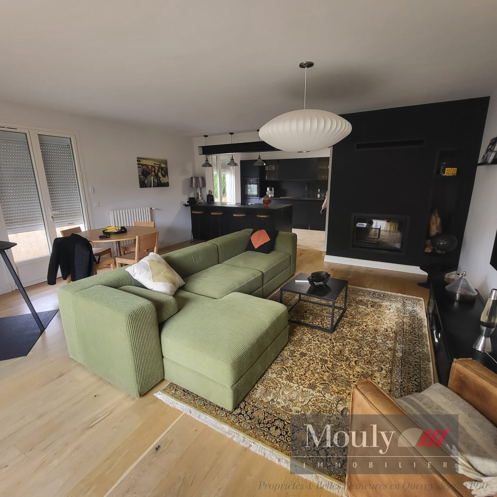 Une cheminée complète l'espace salon.
