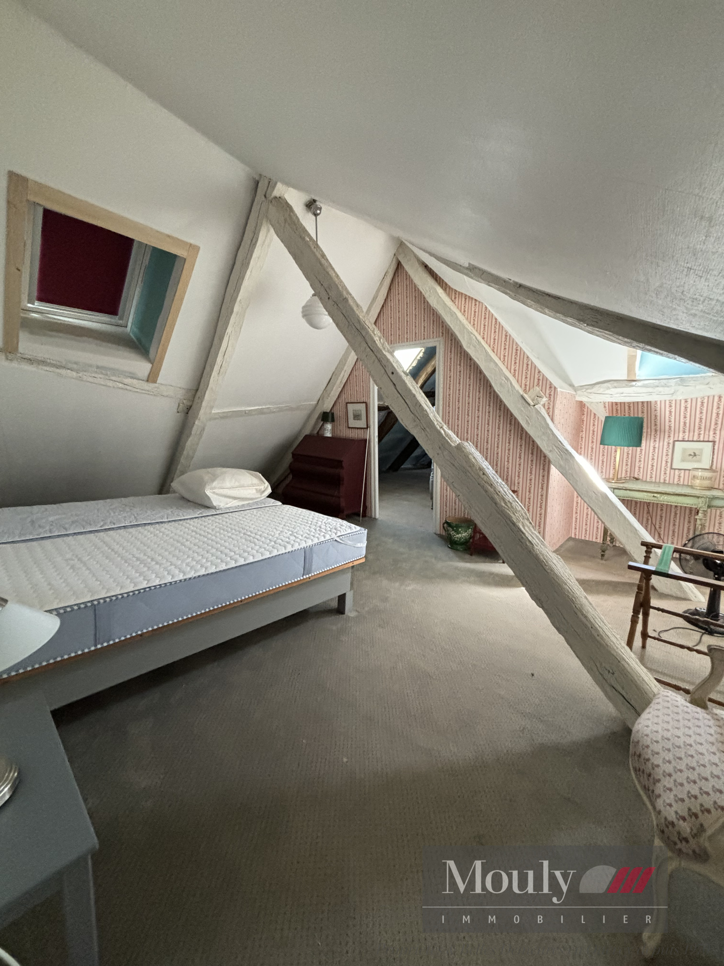 À l’étage, un superbe salon de 55 m² avec plancher en chêne et fresque murale apporte une atmosphère élégante et singulière. On y découvre également une chambre de 35 m², une salle de bain avec douche, un balcon avec vue.