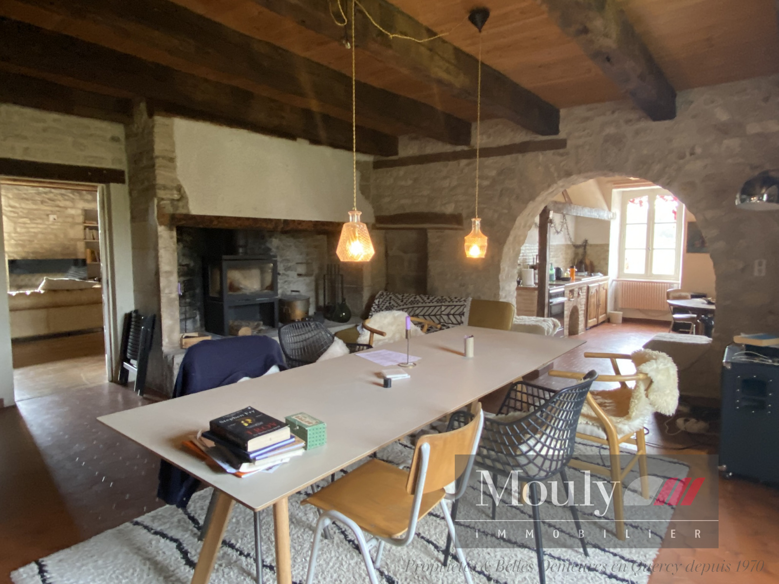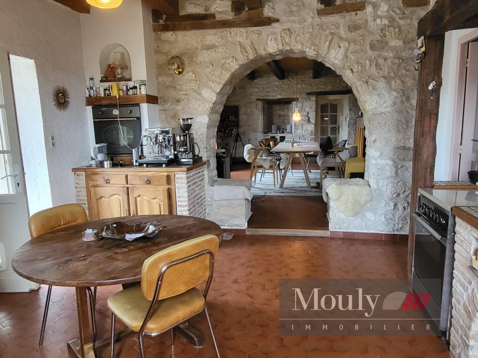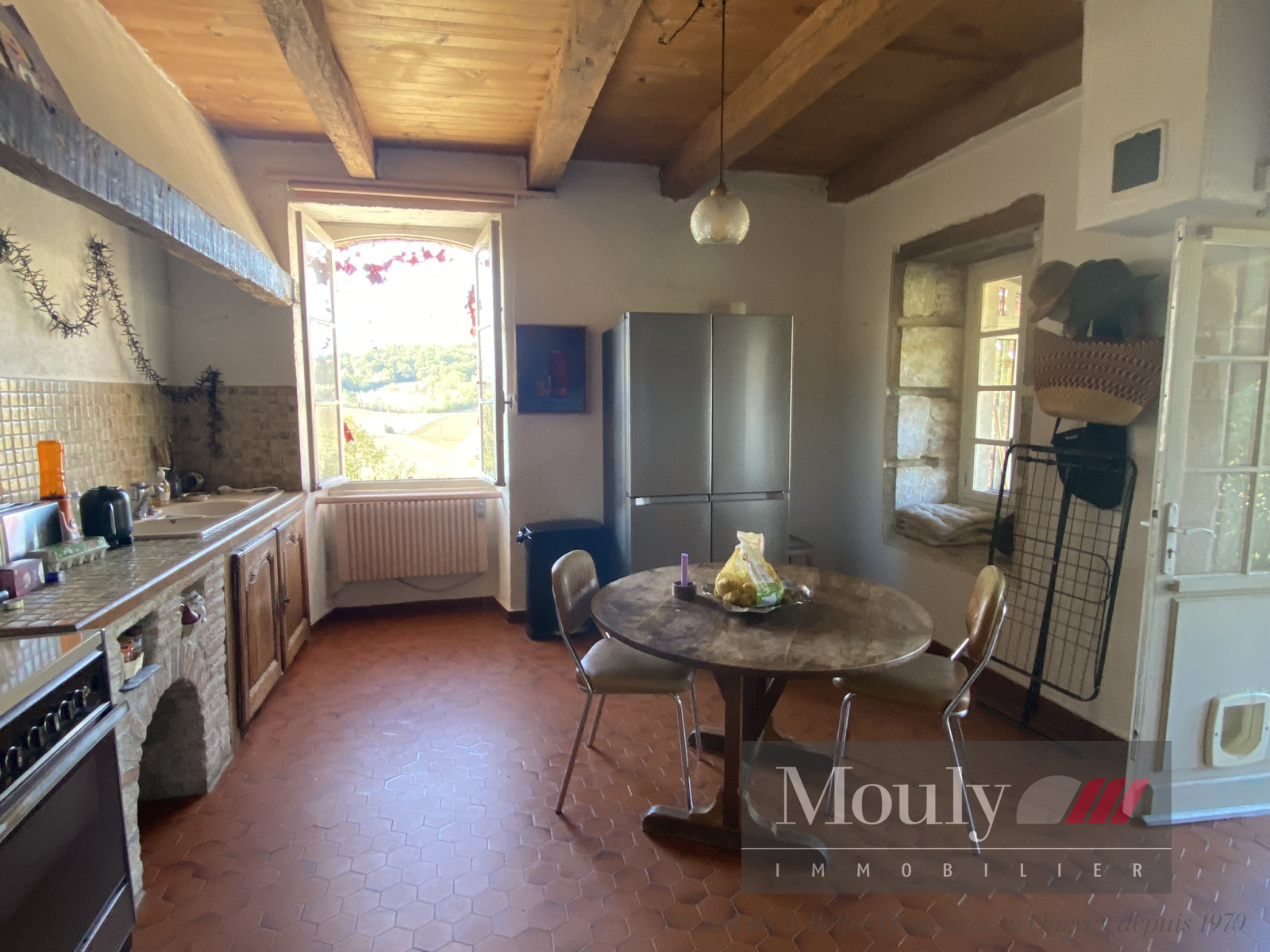 Cuisine avec accès terrasse donnant sur la salle à manger avec cheminée.