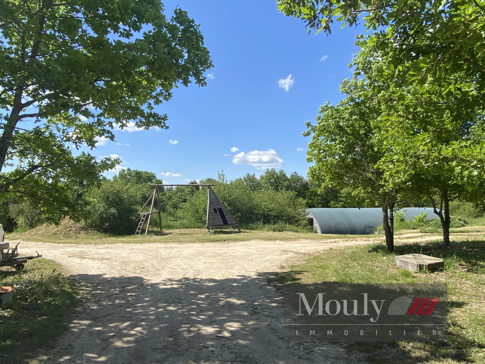 Ensemble comprenant une maison de style passive construite avec des matériaux écologiques, un atelier, et deux tunnels agricoles sur environ 5 hectares de terrain boisé.