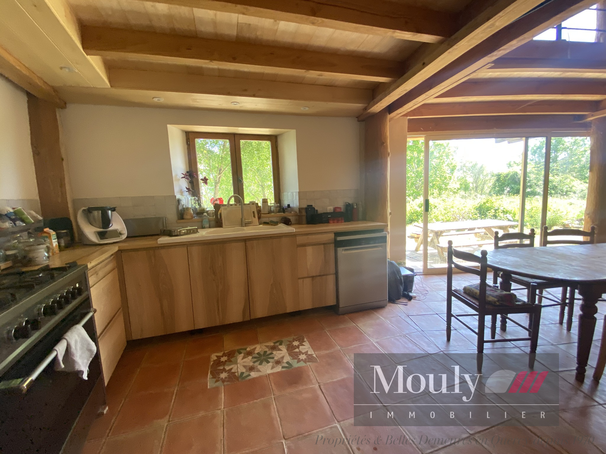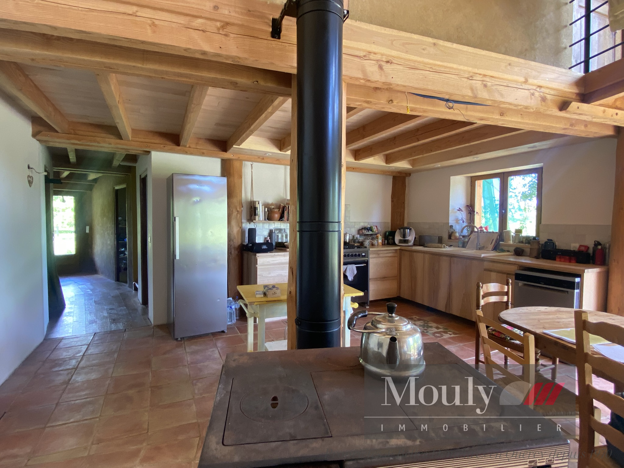 Rez-de-chaussée : entrée, vestiaire et buanderie ouvrant sur une grande pièce de vie très lumineuse d'environ 60m2 avec poêle à bois central et plafond cathédrale, cuisine ouverte et un cellier.