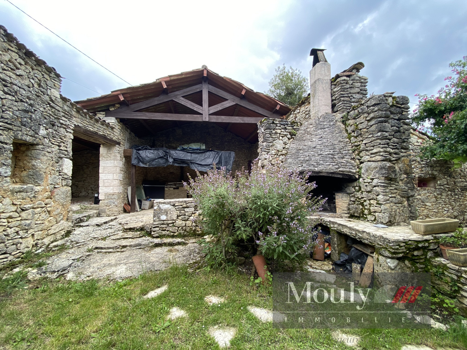 Terrasse couverte et abris de stockage dans l’enceinte des murs en pierre.