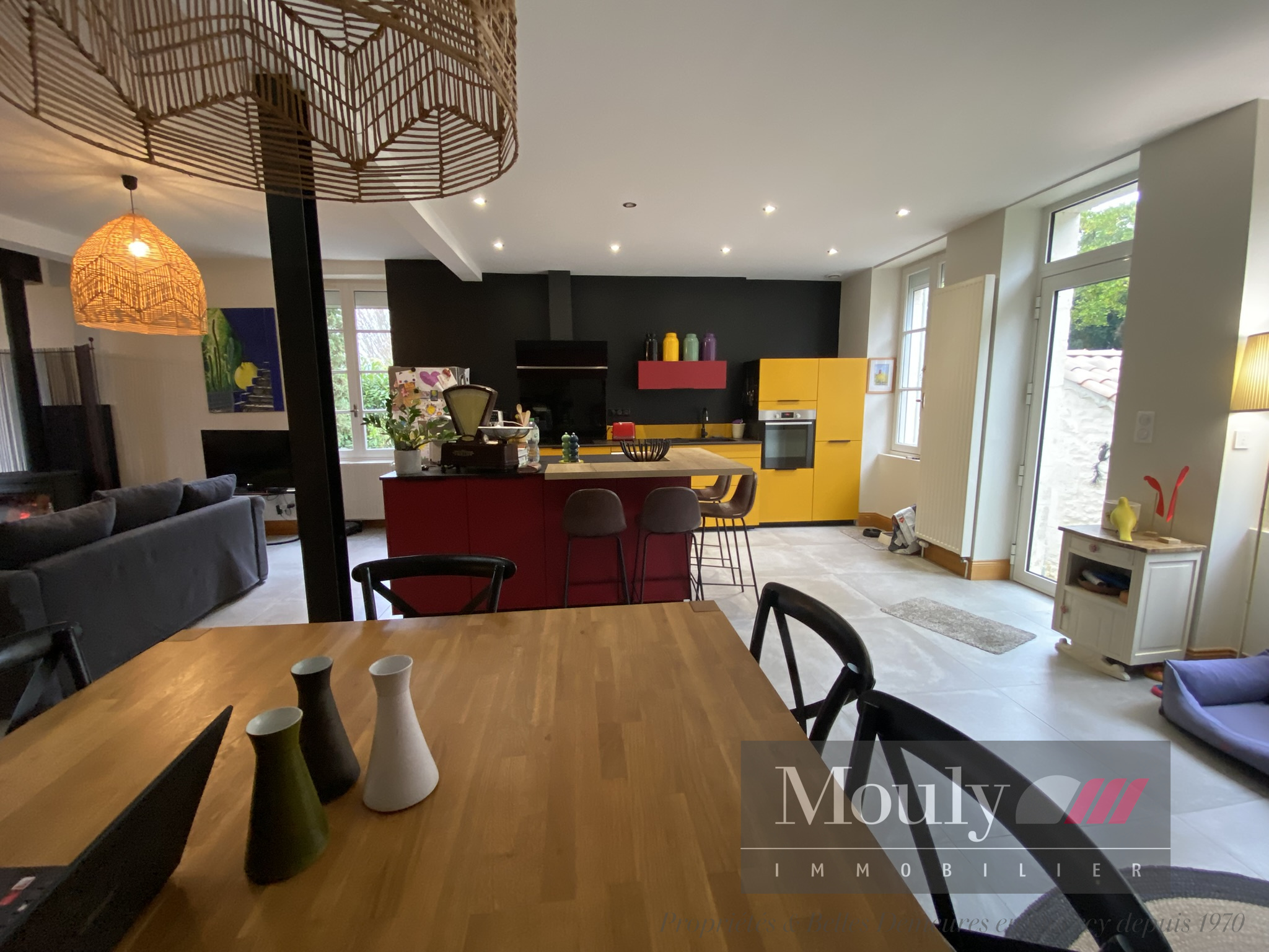 Grande cuisine toute équipée avec des plans de travail en pierre ouverte sur la salle à manger et le séjour avec un poêle à bois central. Un espace de vie traversant avec de belles vues dégagées sur la nature des deux côtés.