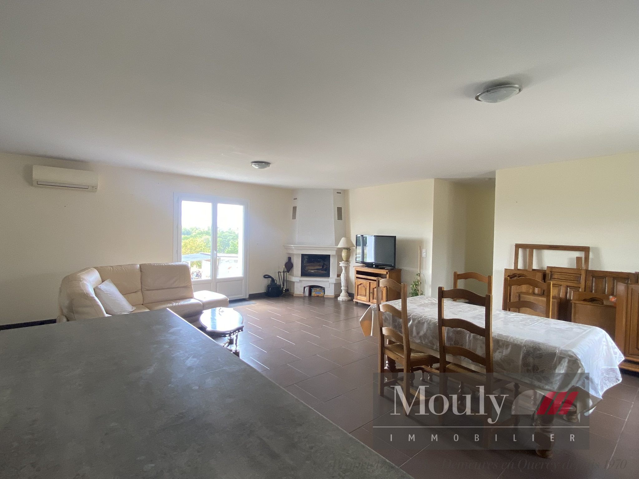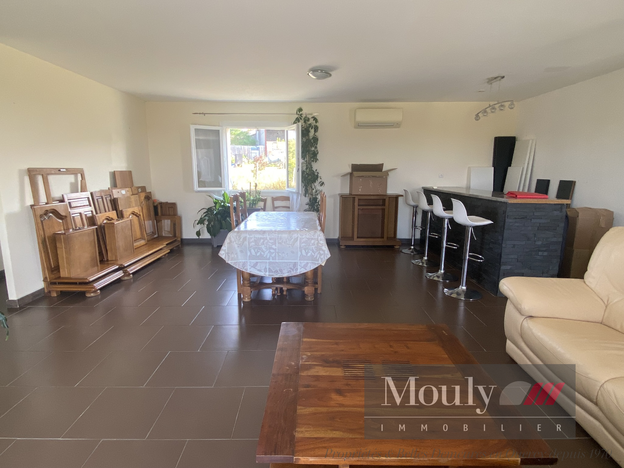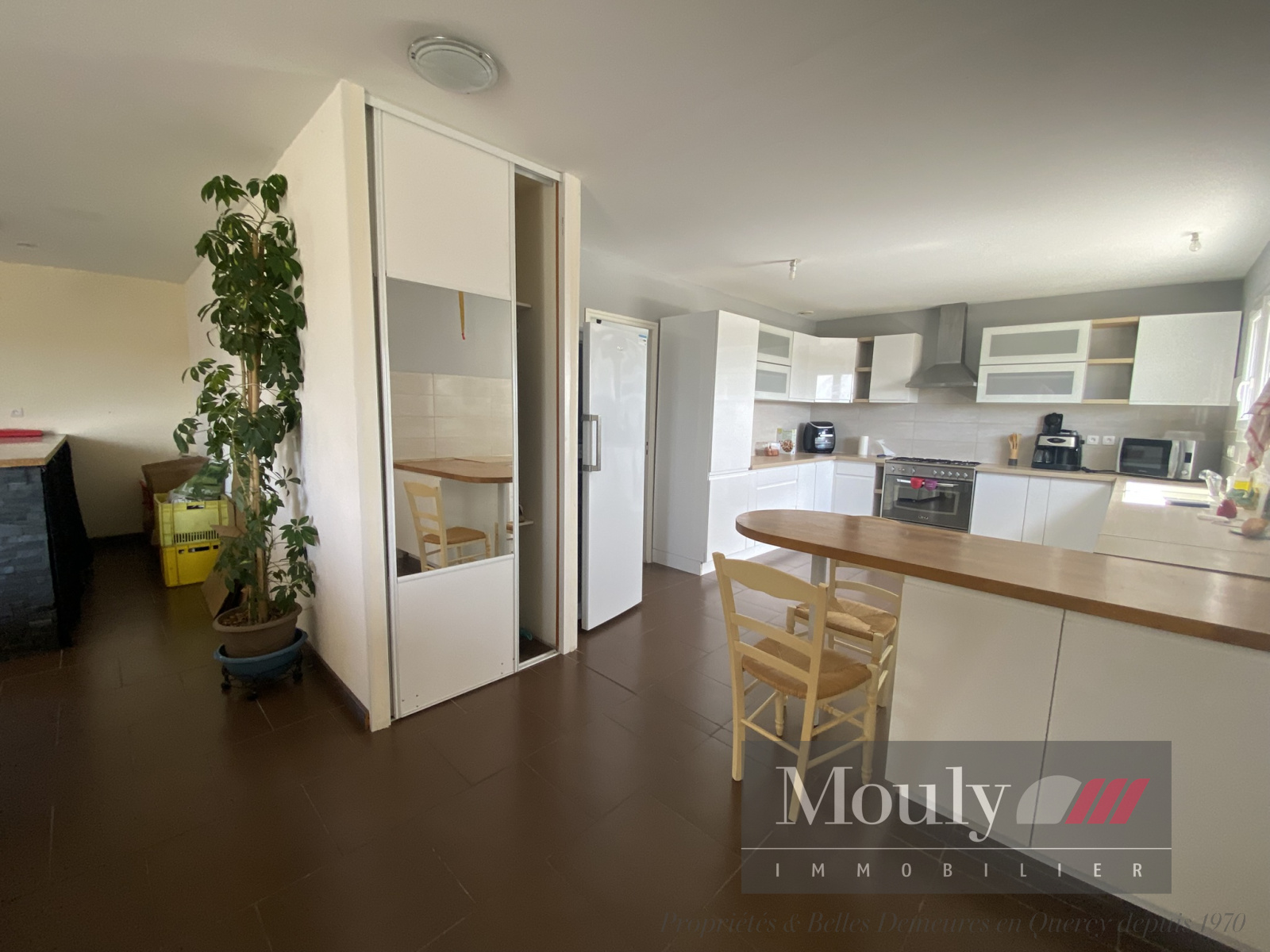Cuisine avec bar donnant sur la salle à manger/séjour ouverte sur la terrasse.