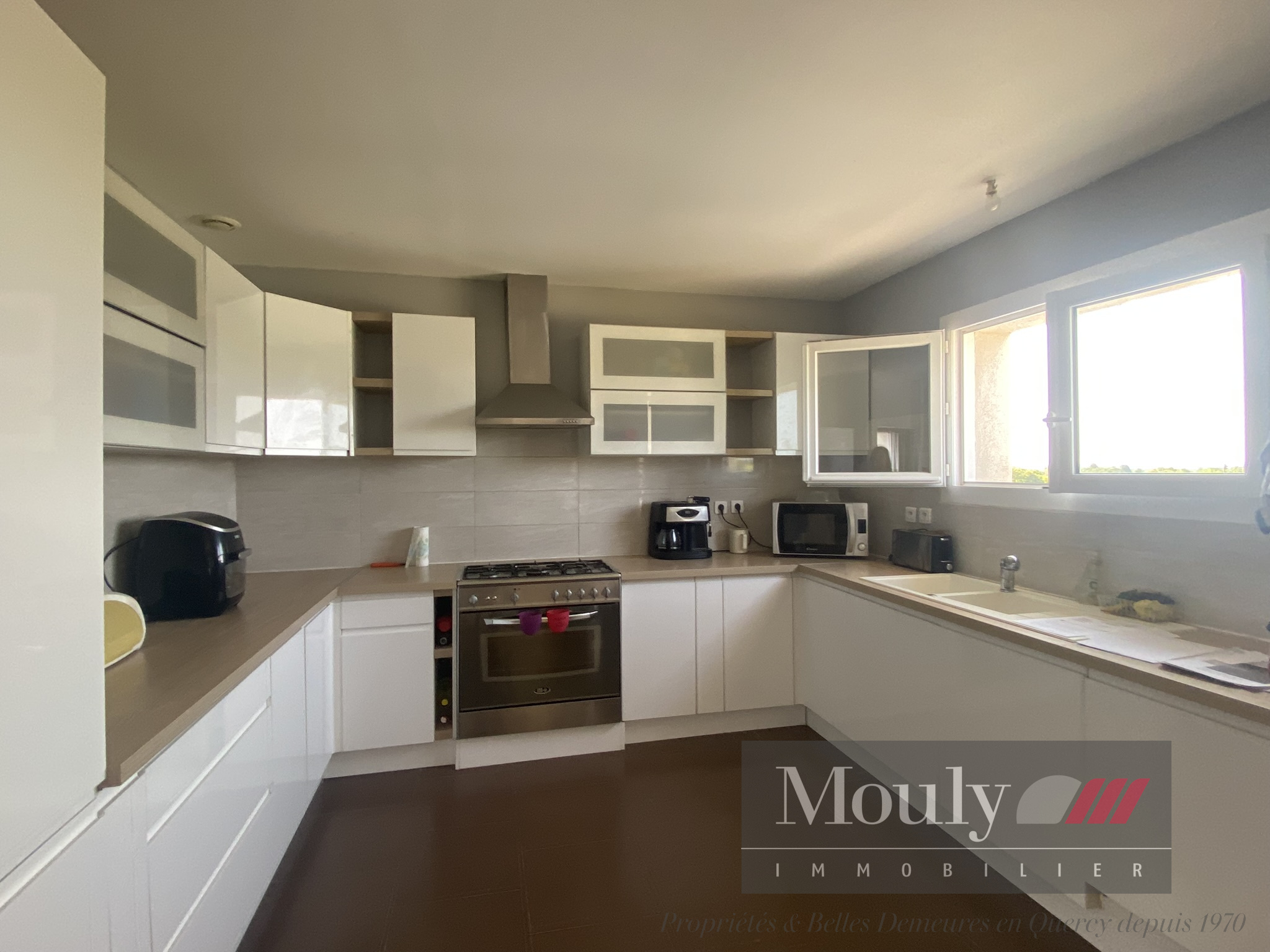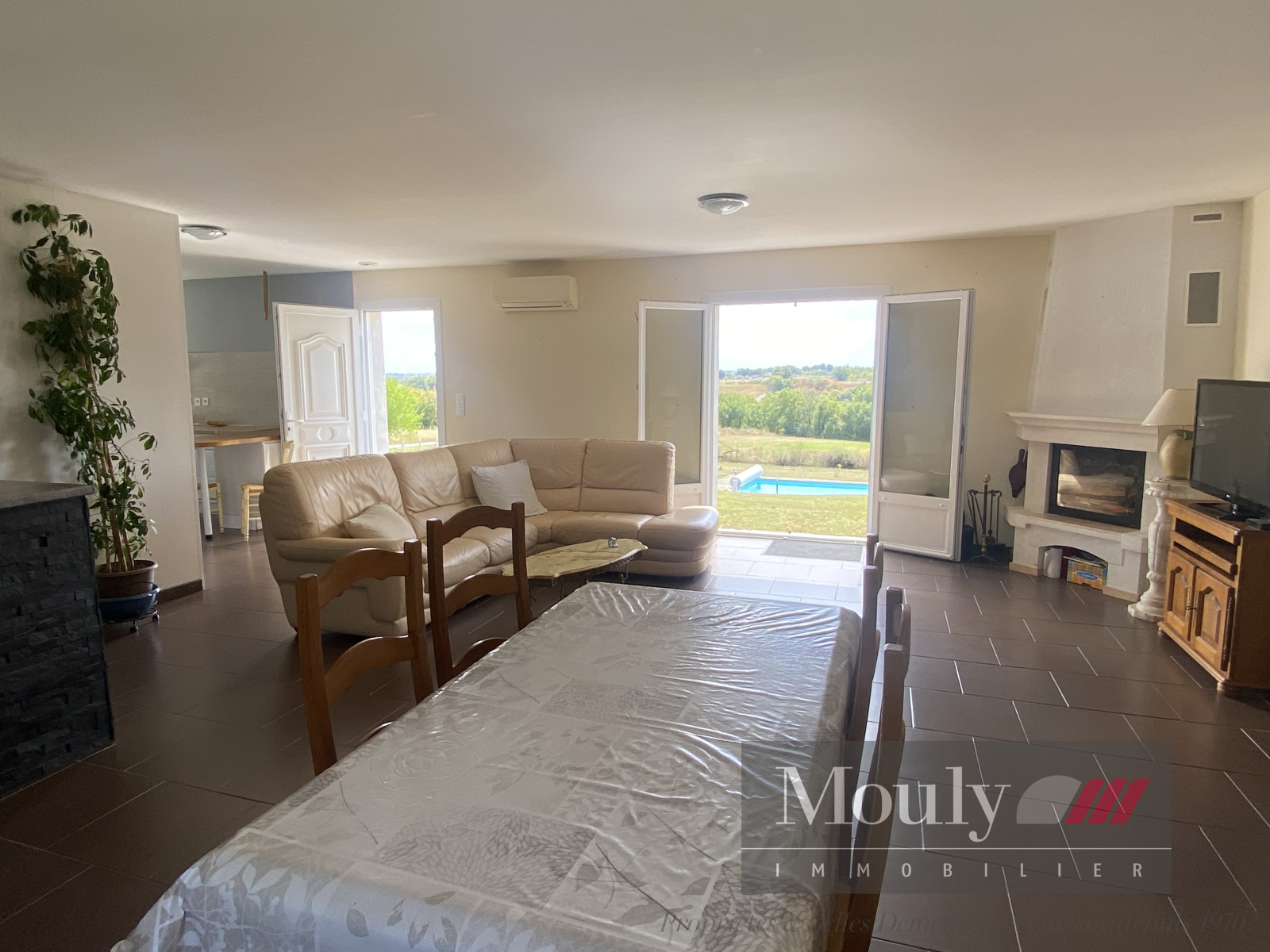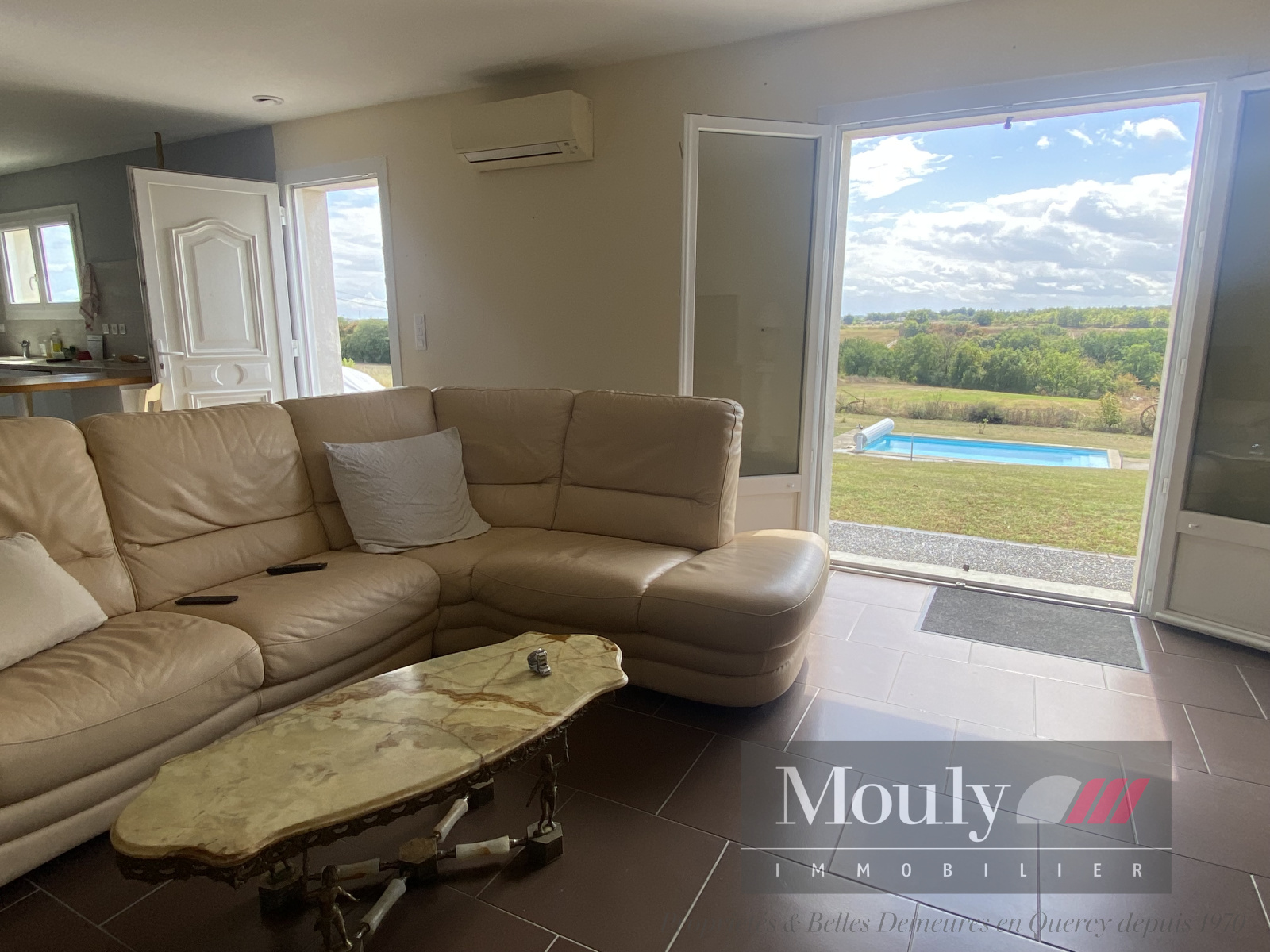 Cuisine avec bar donnant sur la salle à manger/séjour ouverte sur la terrasse.