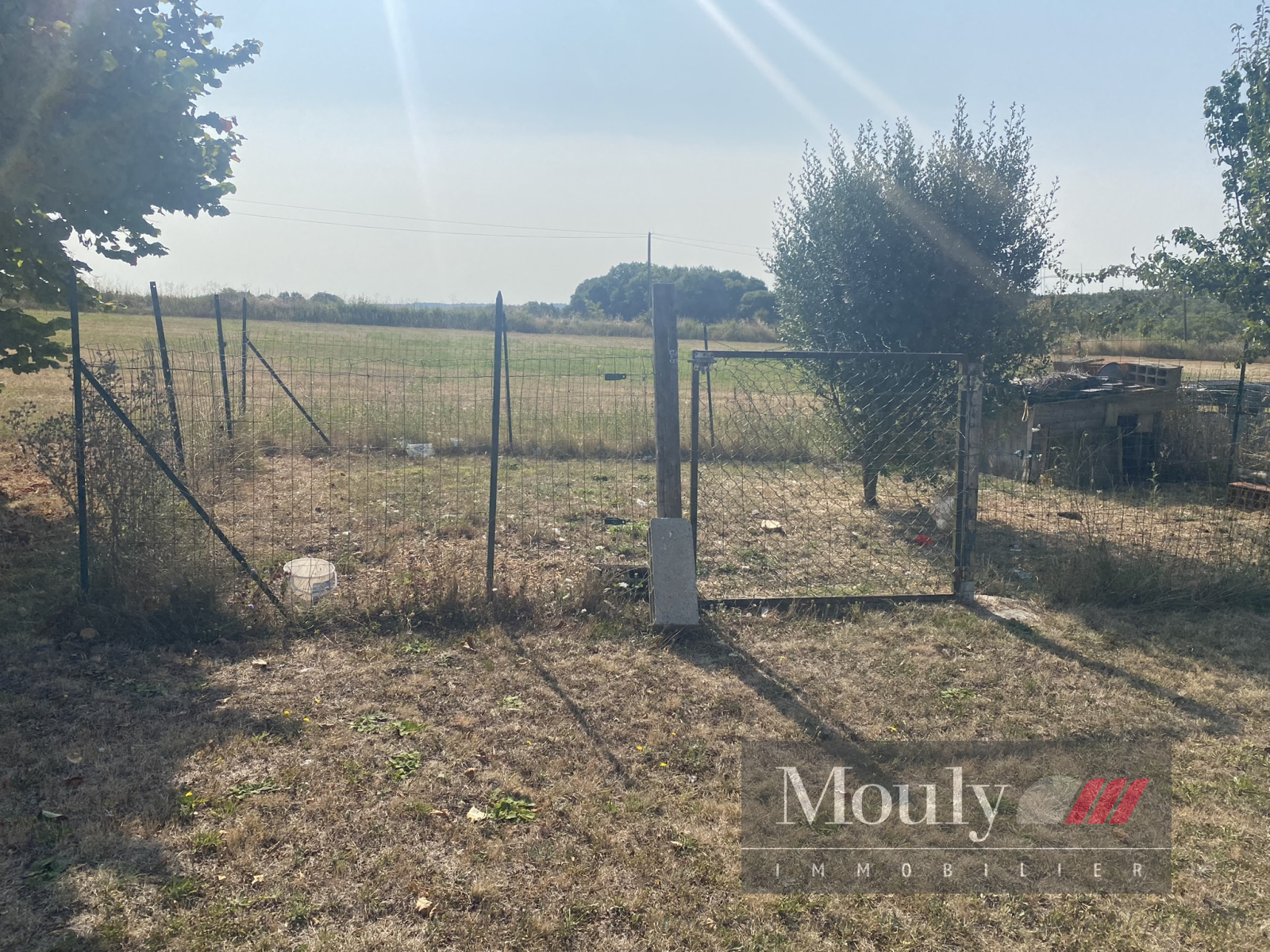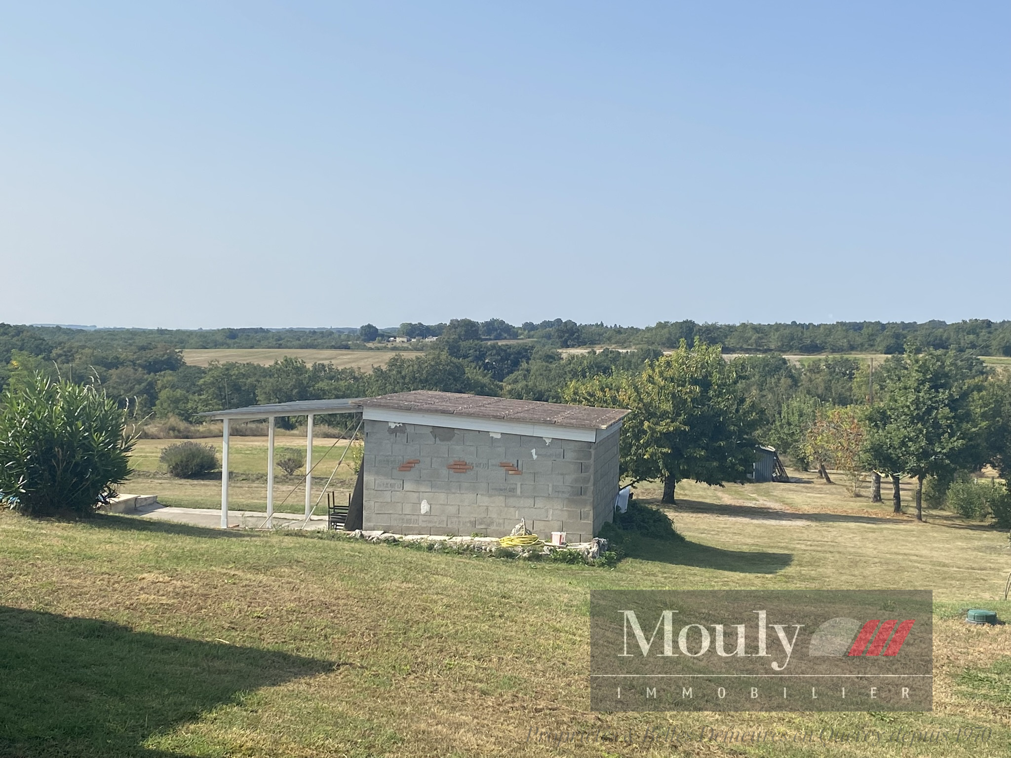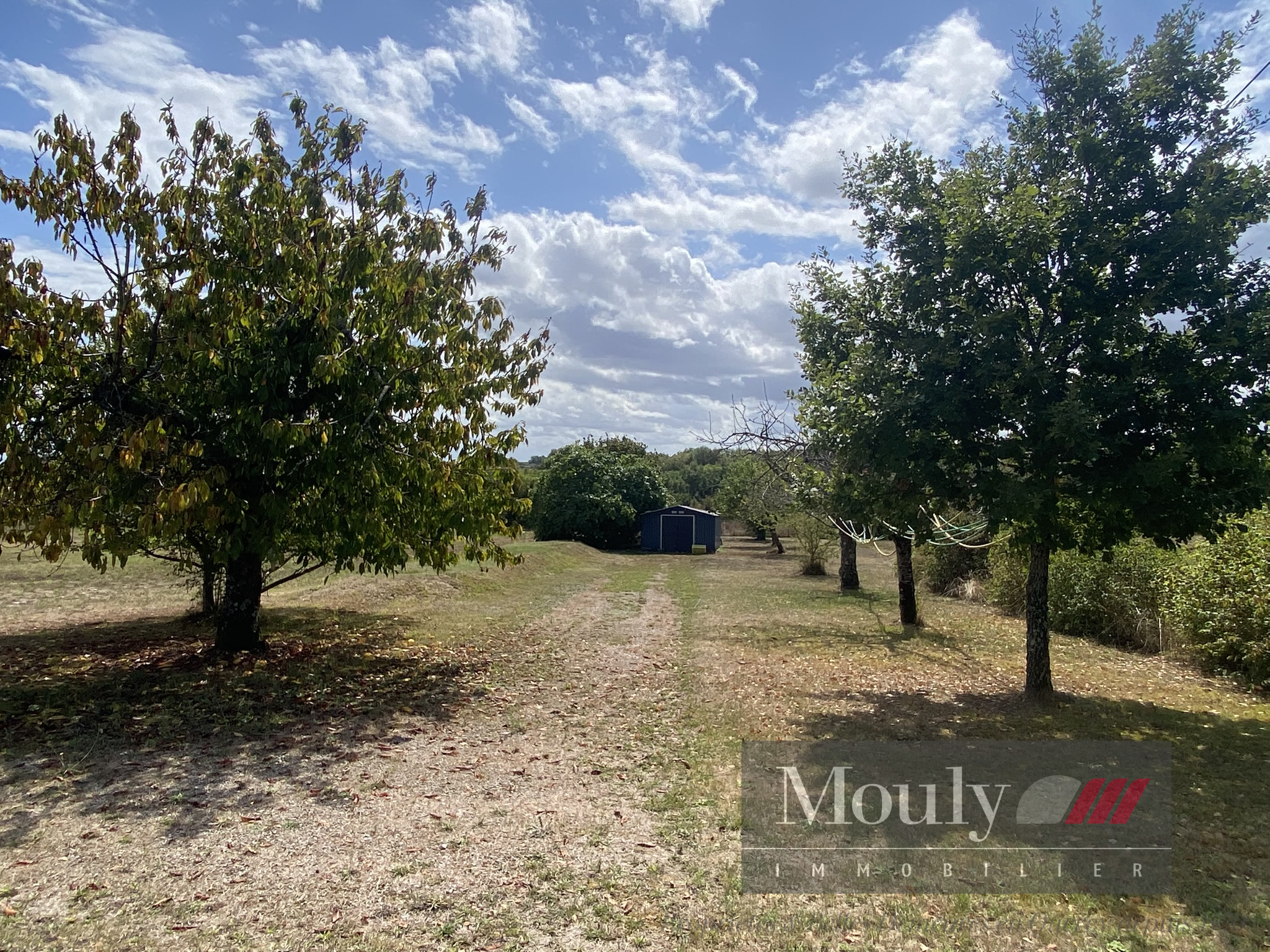 Jardin avec cabanon et arbres fruitiers.