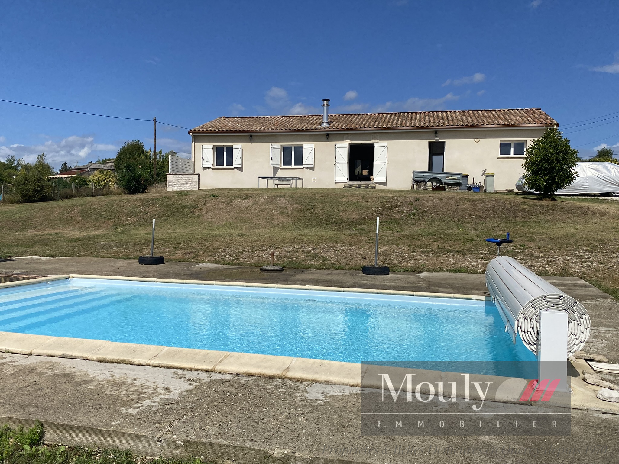 Piscine 7m x 4m avec marches et couverture rigide. Local technique, cabanon de jardin et arbres fruitiers.