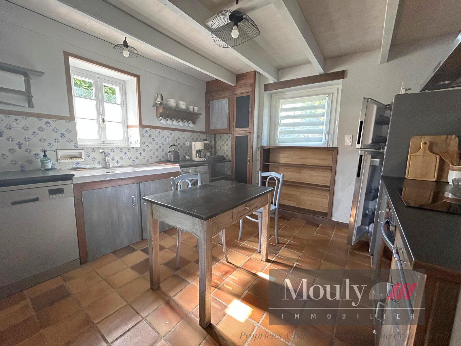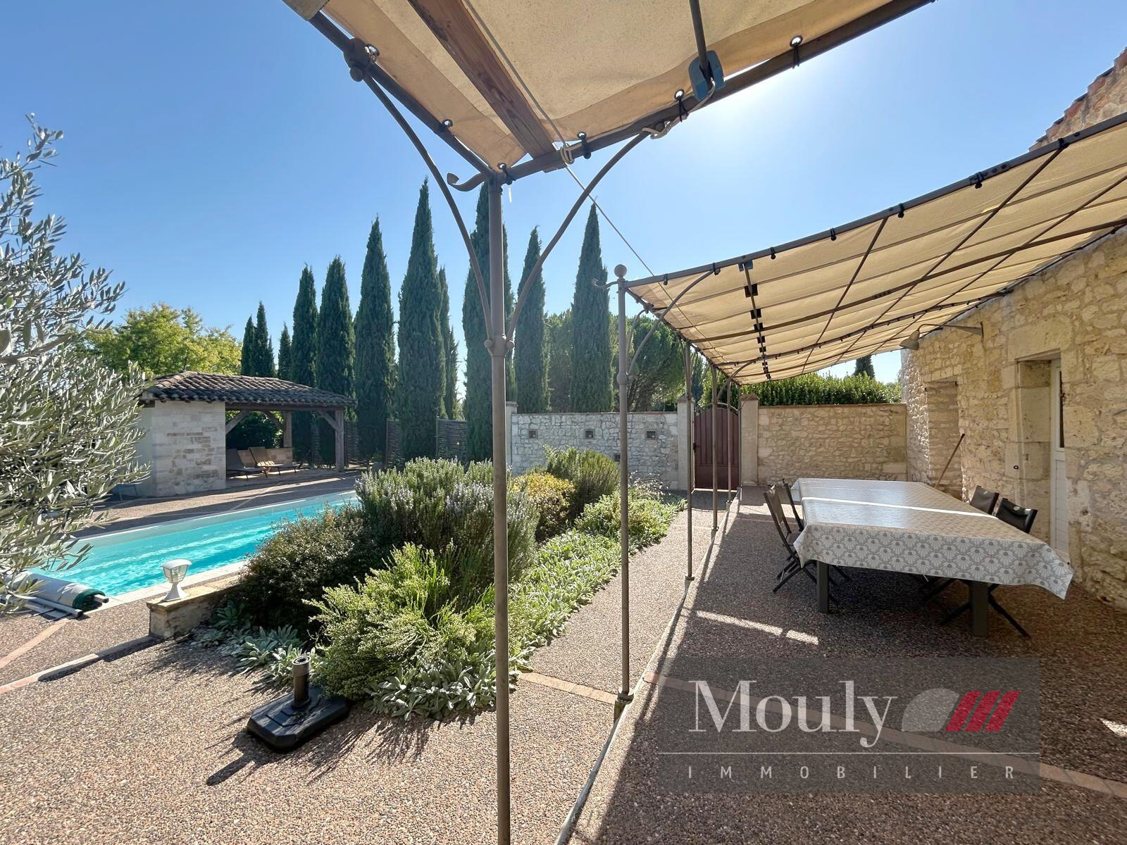 Rénovation sympathique pour la maison principale avec des pièces à vivre d'environ 80m2 habitable sur un seul niveau comprenant une cuisine avec cheminée ouverte, une grande pièce de réception avec salon et salle à manger et un bureau très lumineux et quadruple exposition. Une belle hauteur sous plafond avec poutres apparentes et un poêle à bois central. Une chambre parentale et salle de bains se situe en rez-de-jardin avec accès jardin et piscine. Sous les combles se trouvent deux chambres et une salle d'eau. Une belle cave voutée et sa cave à vin en très bon état.