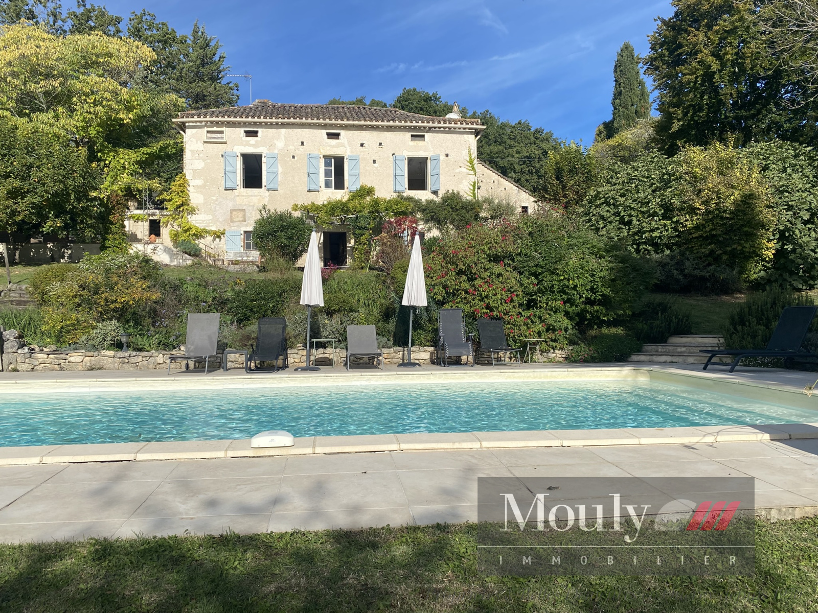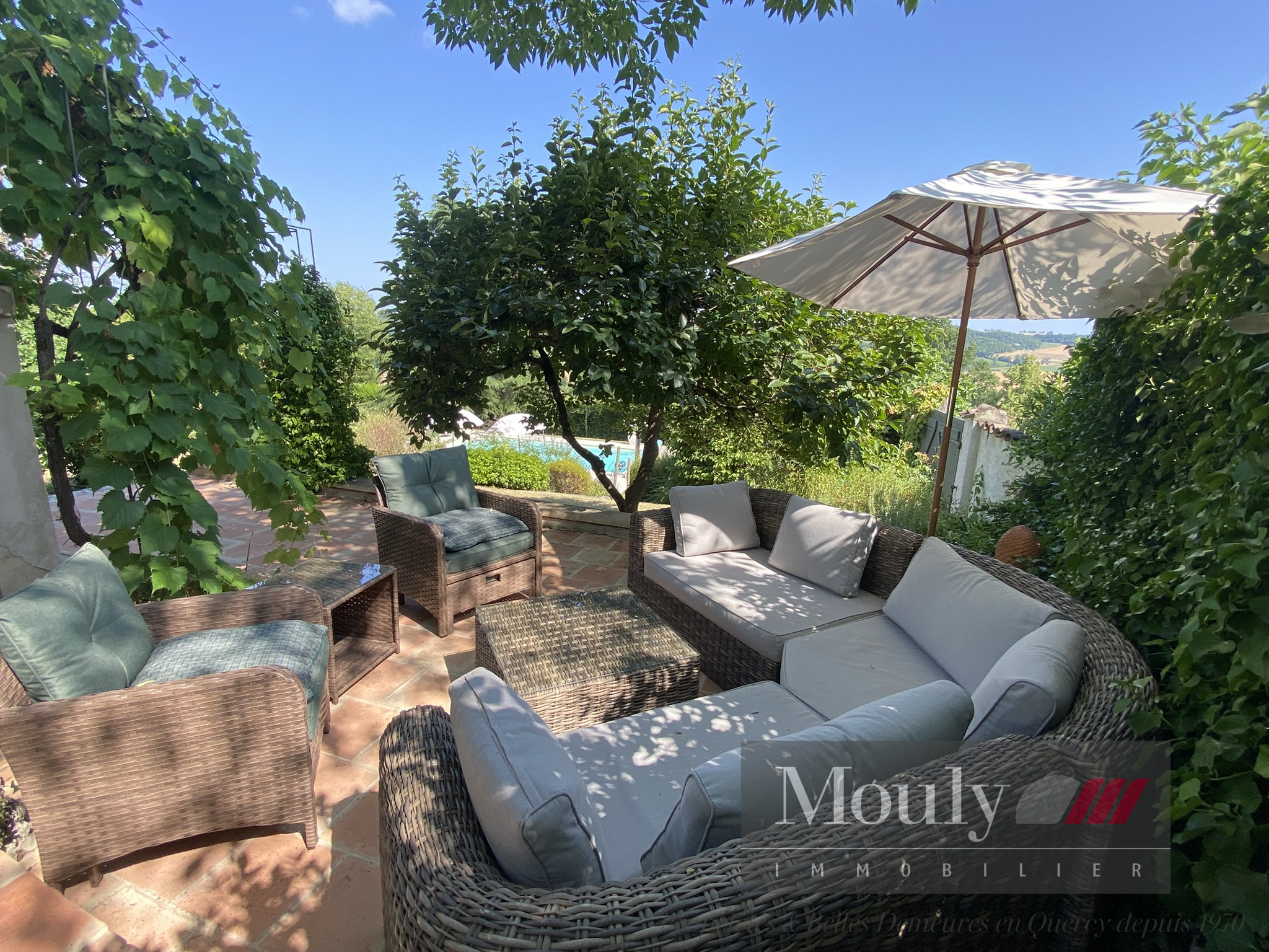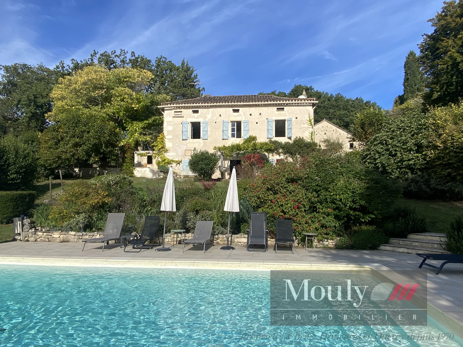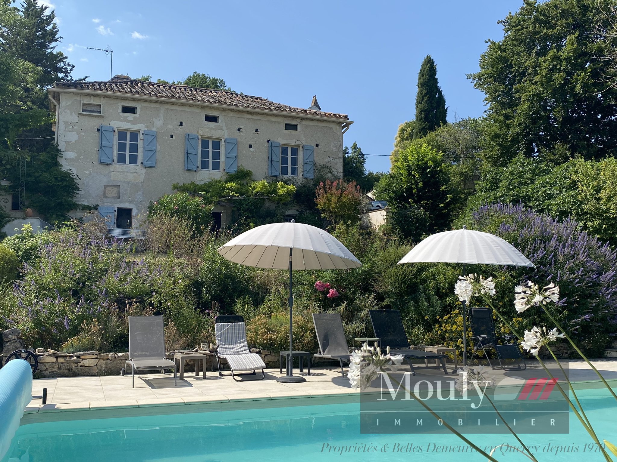 Une maison authentique qui séduit par sa vue dégagée, sa piscine ensoleillée, sa grange en pierre, et son jardin mature et richement planté. Chaque recoin invite à la détente - la terrasse repas, la terrasse séjour ombragée, la belle plage de la piscine, le coin jeu dans la grange.
