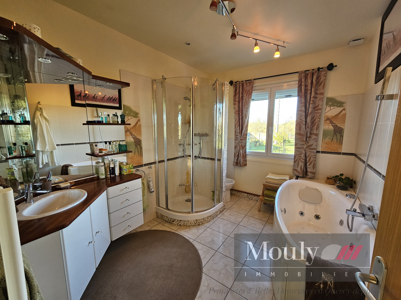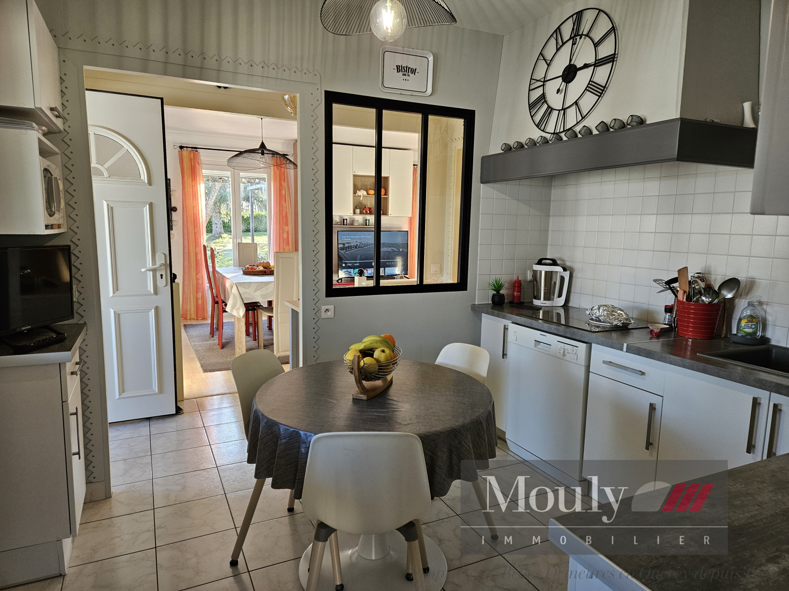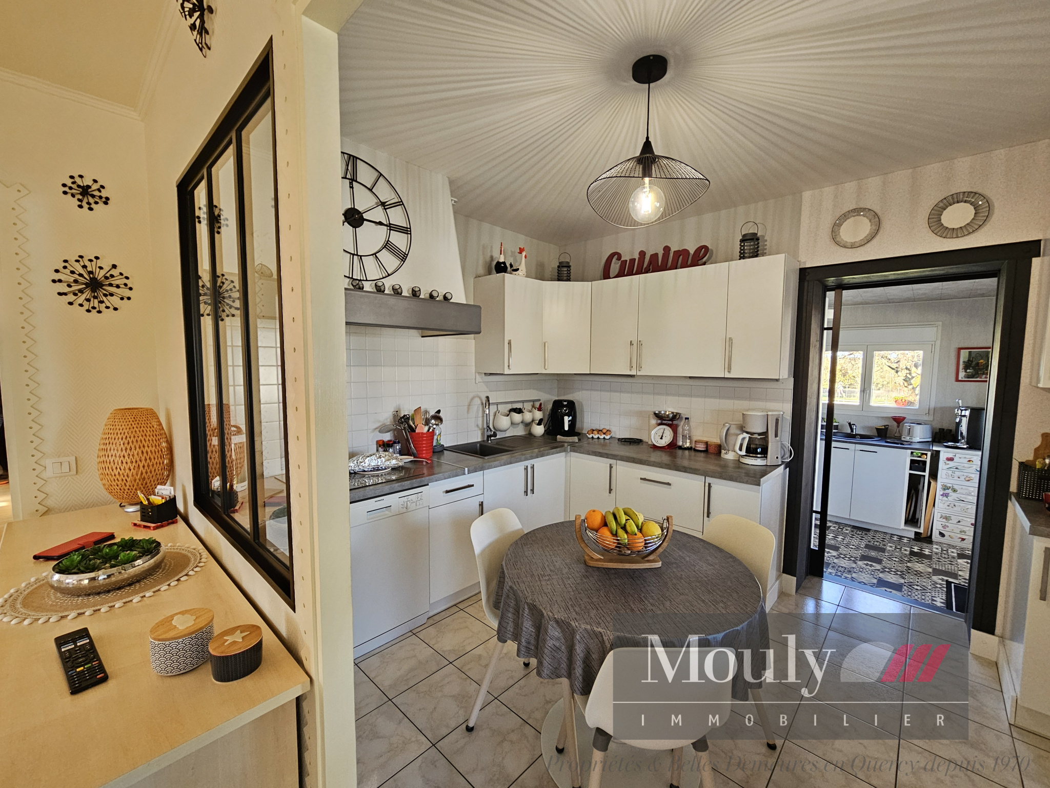 Entrée, cuisine équipée avec arrière cuisine, salon/salle à manger avec poêle à granulés et climatisation + double vitrage, 3 chambres dont une avec sa salle d'eau, salle de bains ( douche + bain), 2 wc, bureau, cellier.