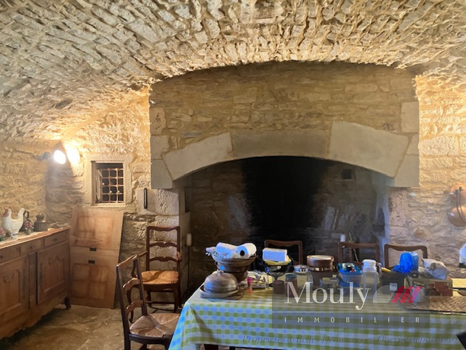 Une cuisine aménagée dans une pièce voutée de 30m² avec grande cheminée et évier en pierre d'époque.