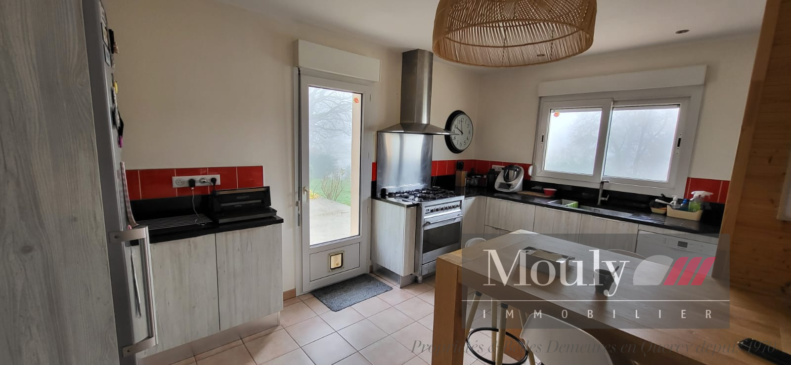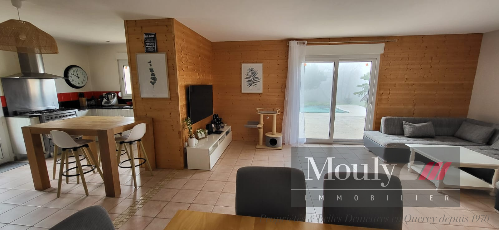 L’espace de vie se compose d’une cuisine ouverte sur le séjour, offrant un accès direct vers la terrasse et la piscine.
