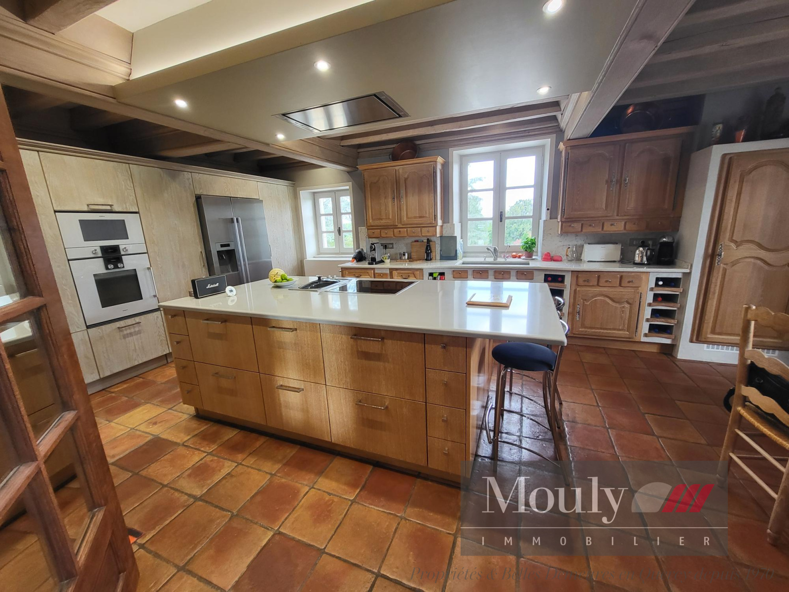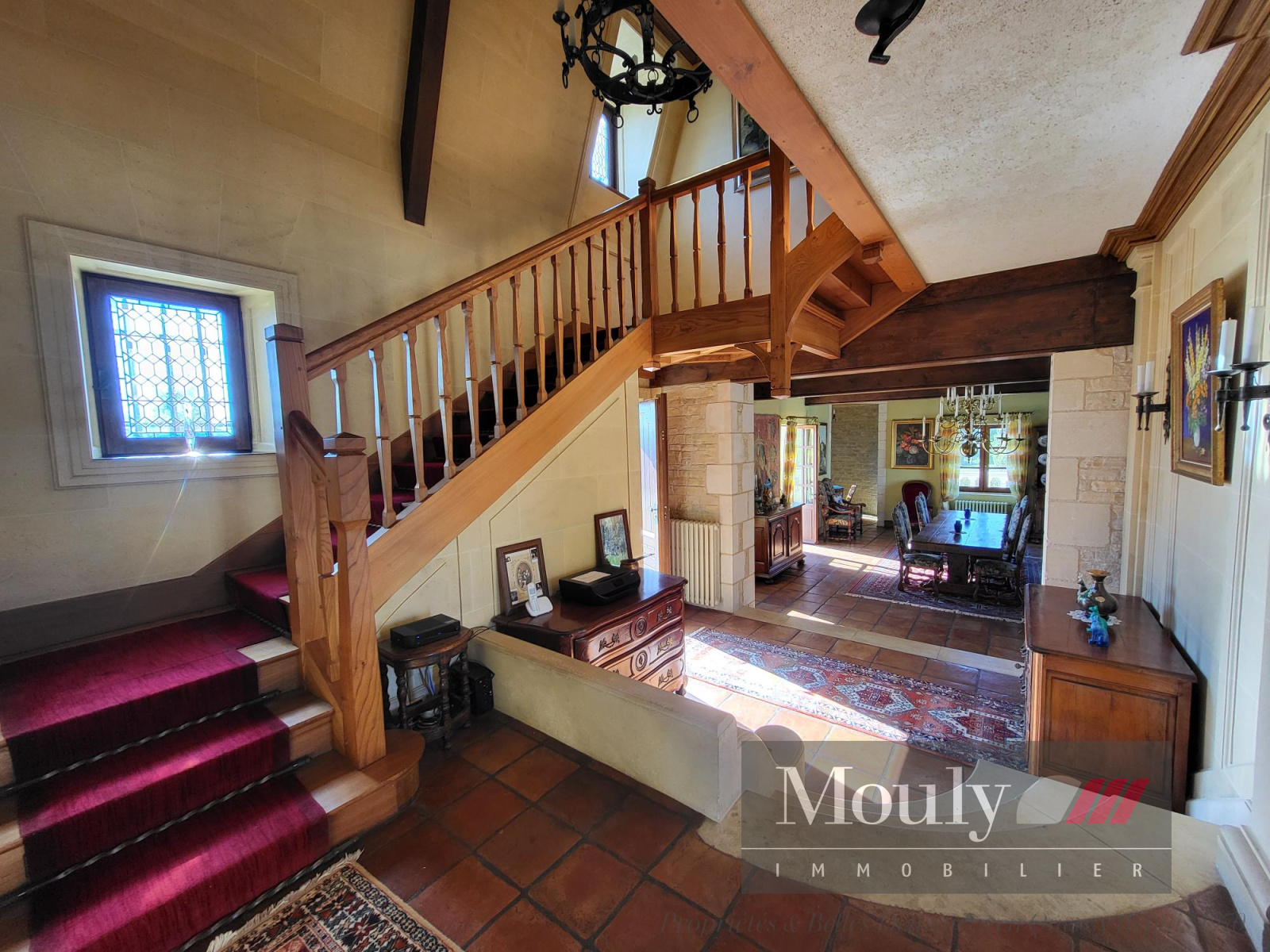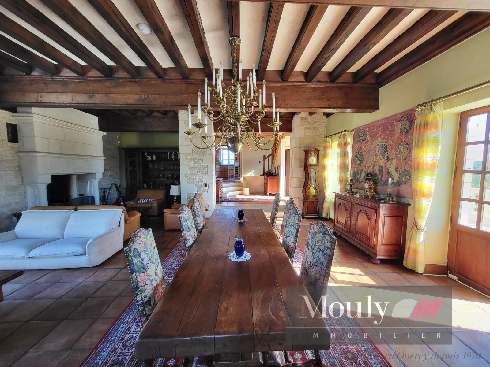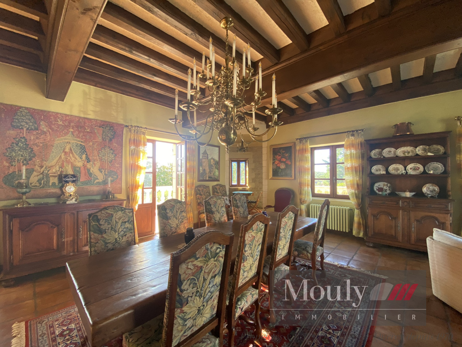Vous y retrouverez aussi une salle à manger (60m²) avec plafond à la française et sa cheminée d'époque ; une cuisine équipée récente de 35m².