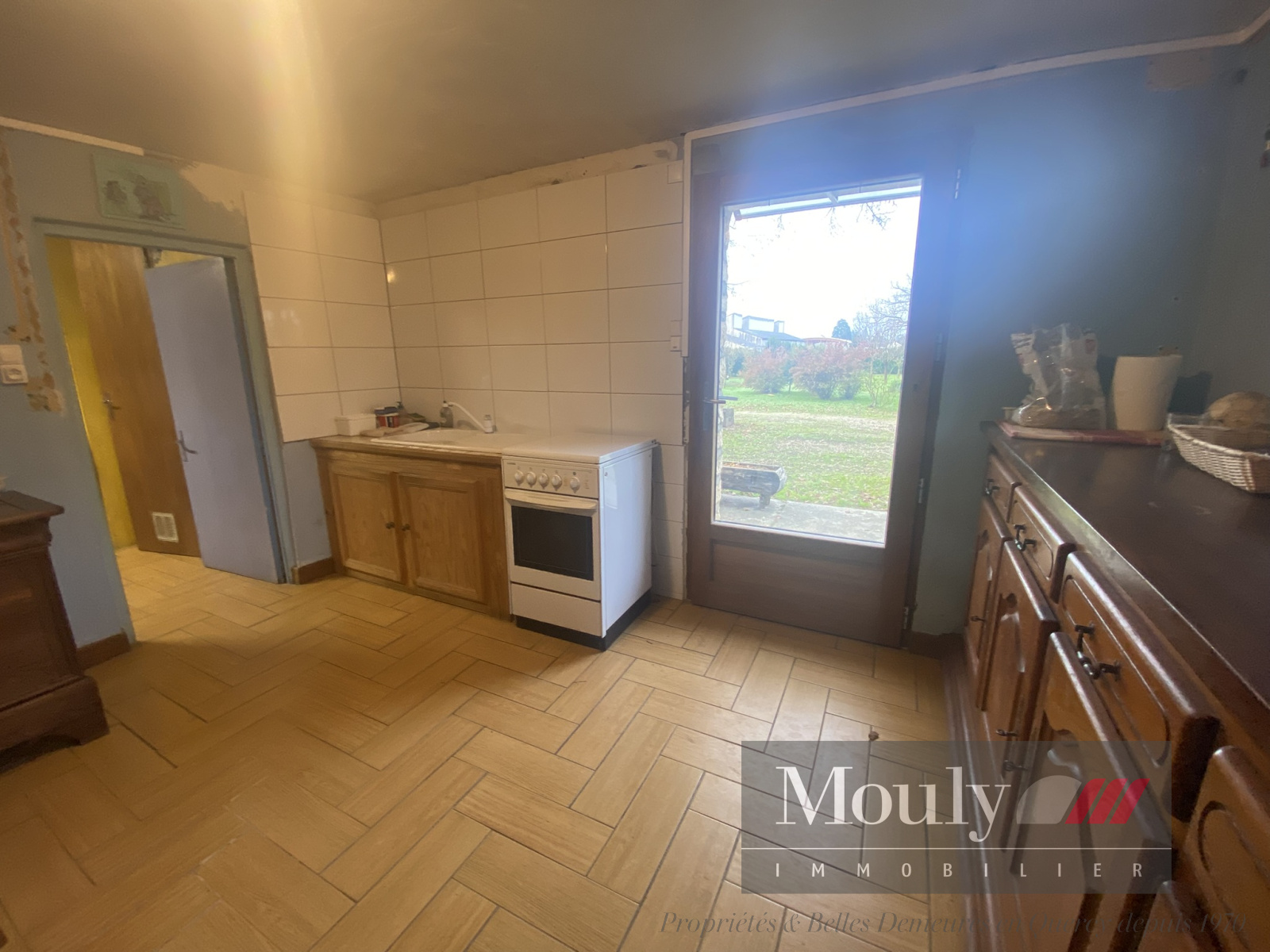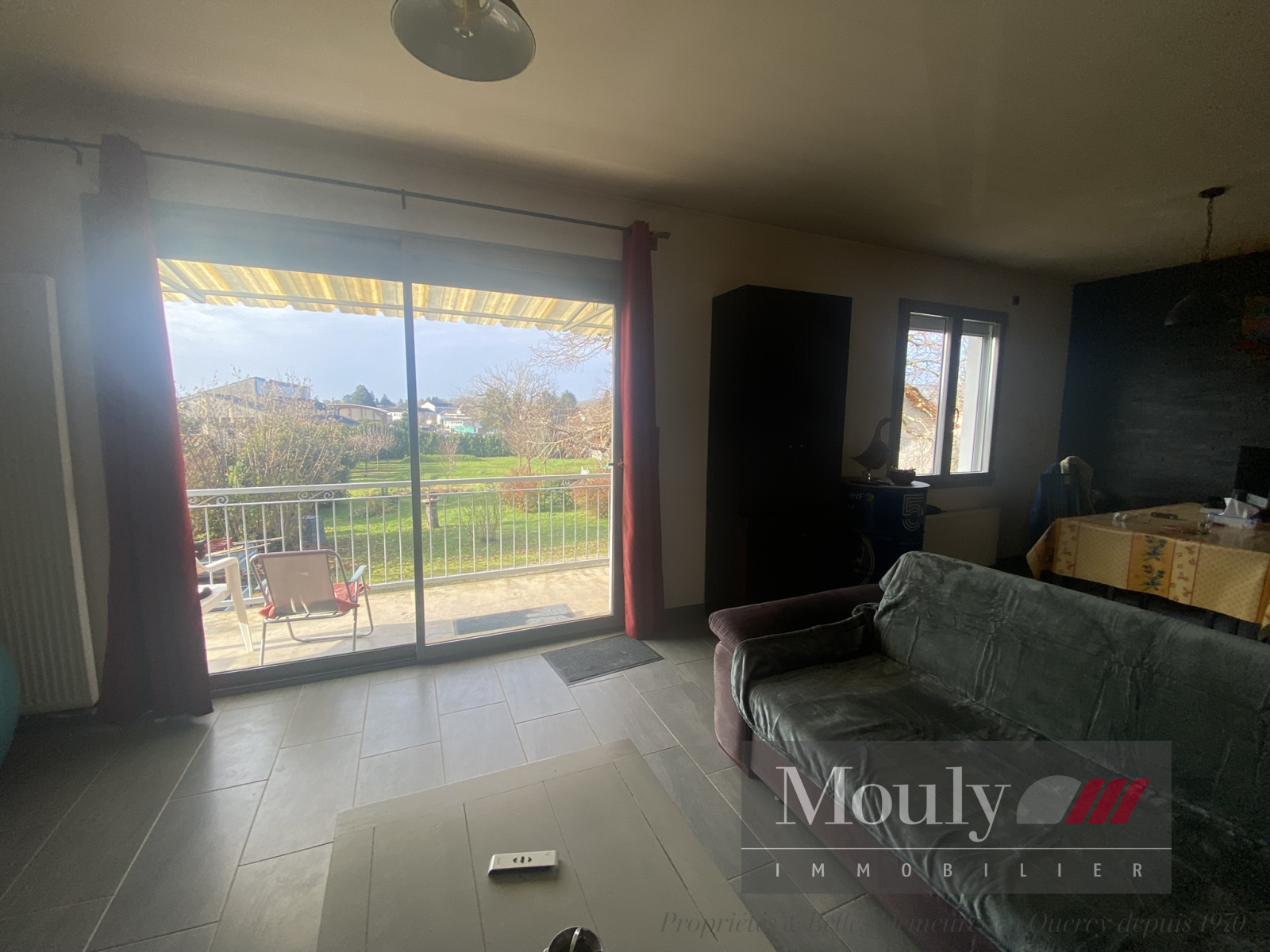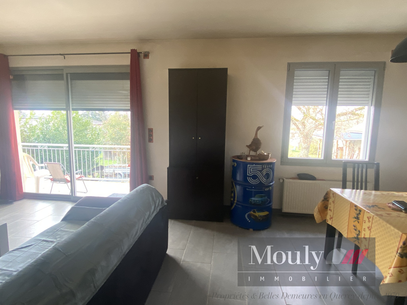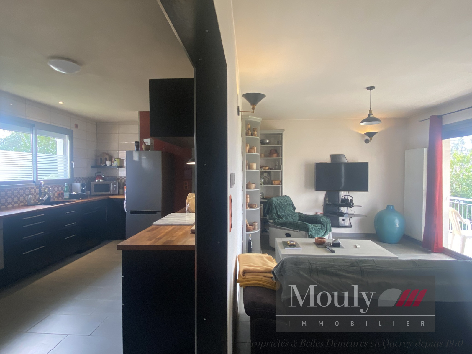 Entrée, cuisine, salon/salle à manger avec accès terrasse.