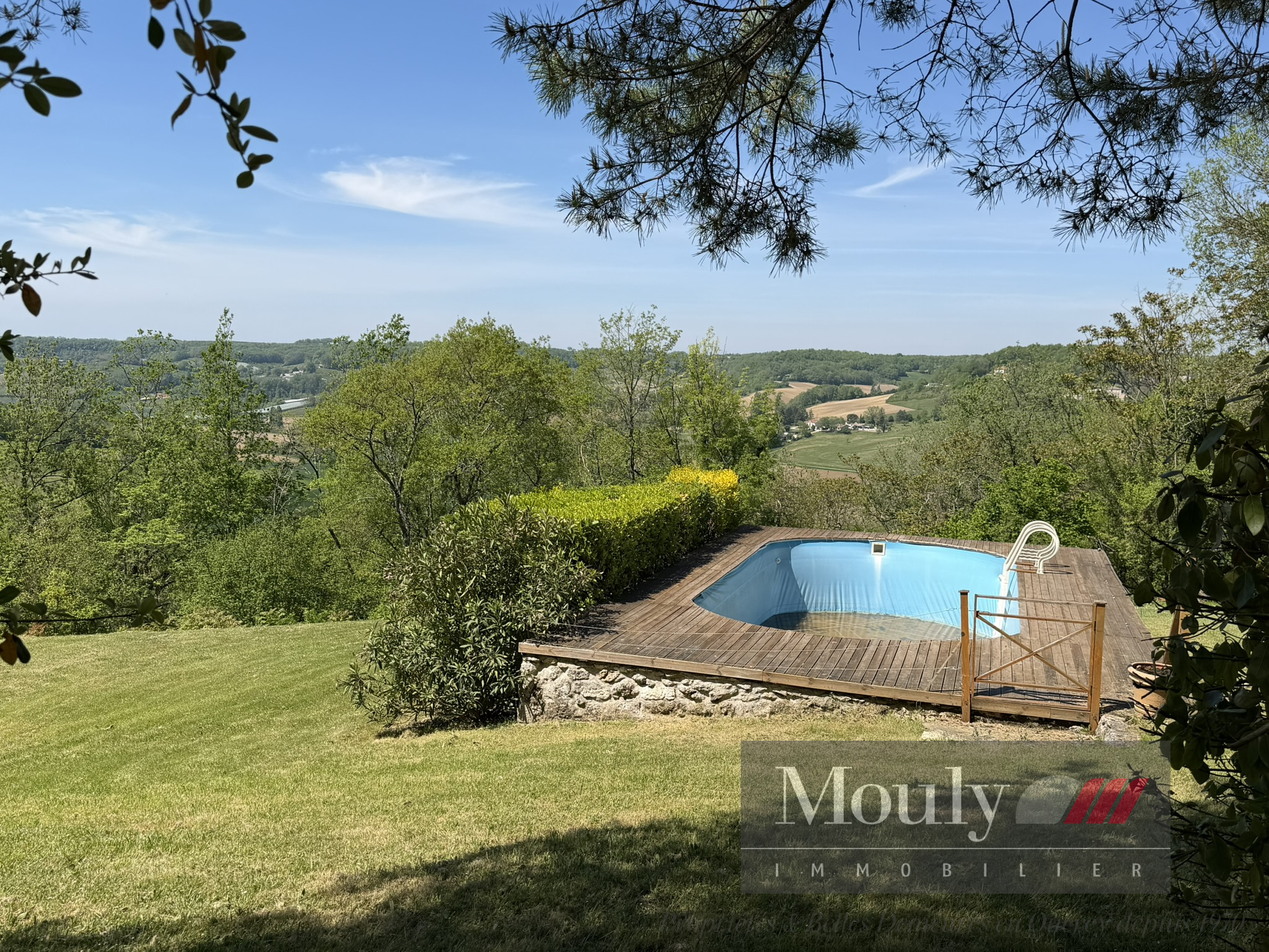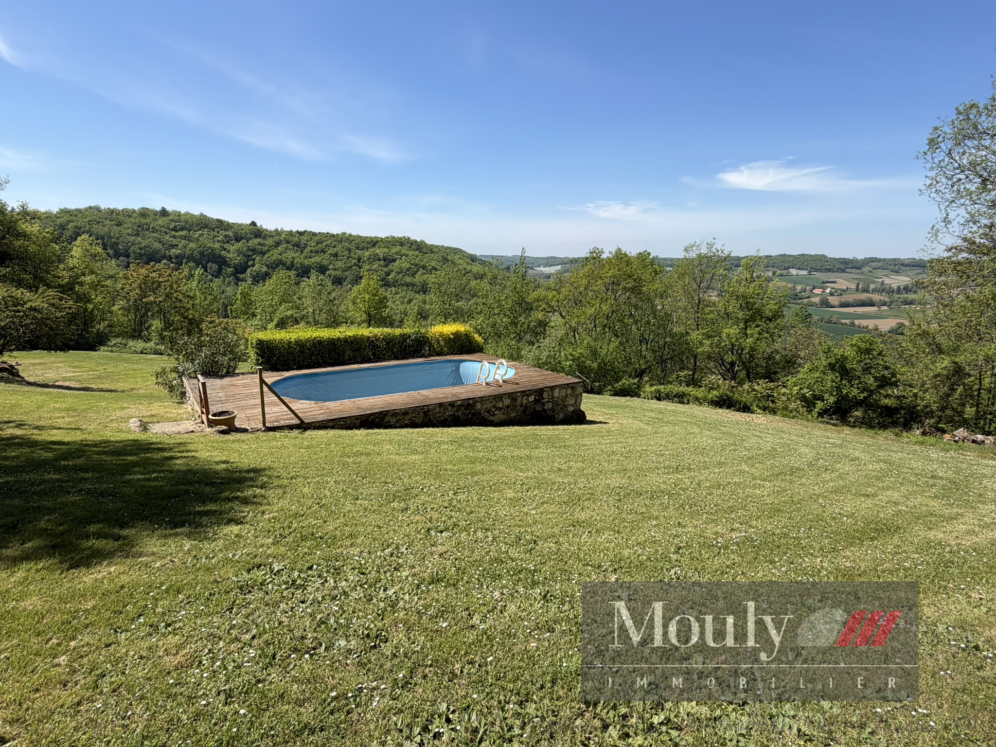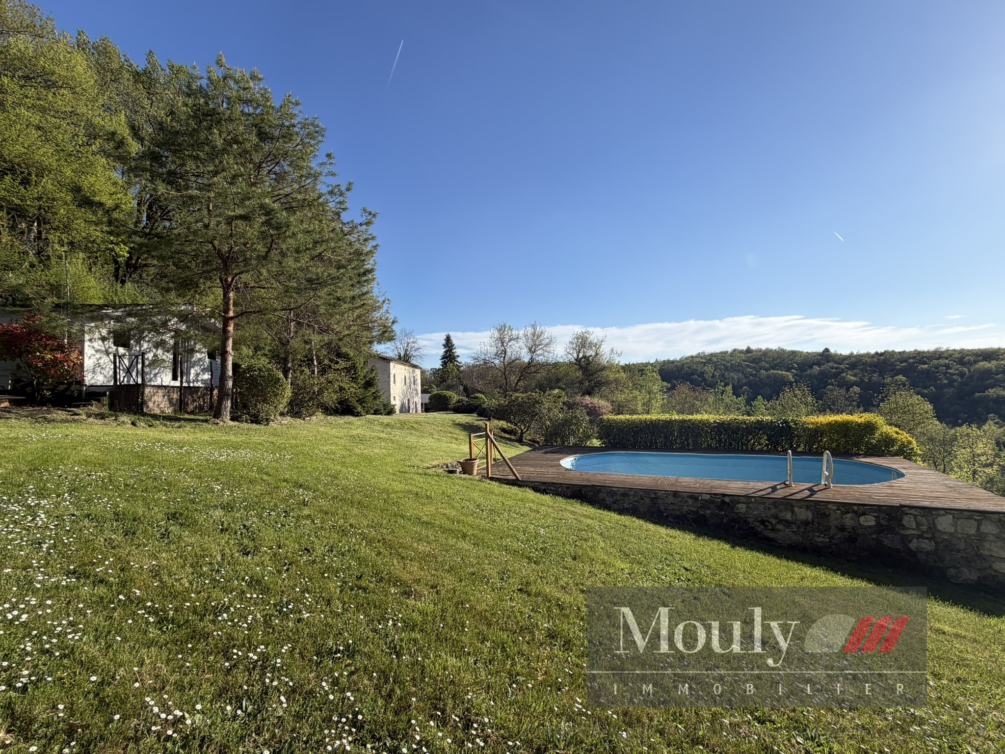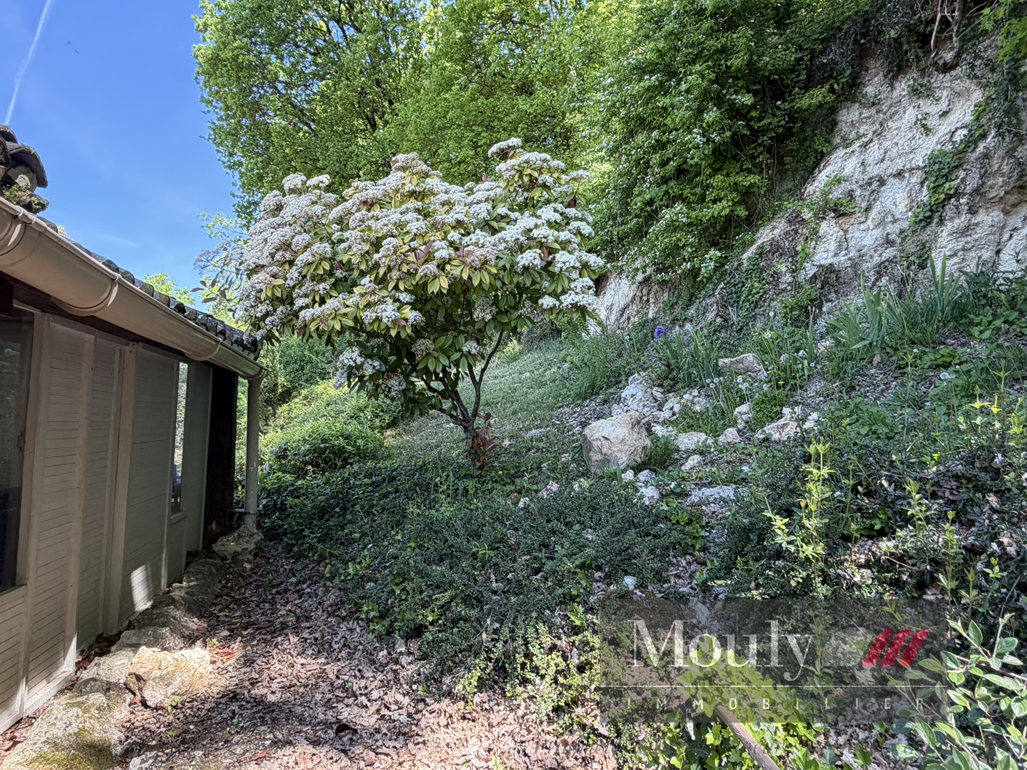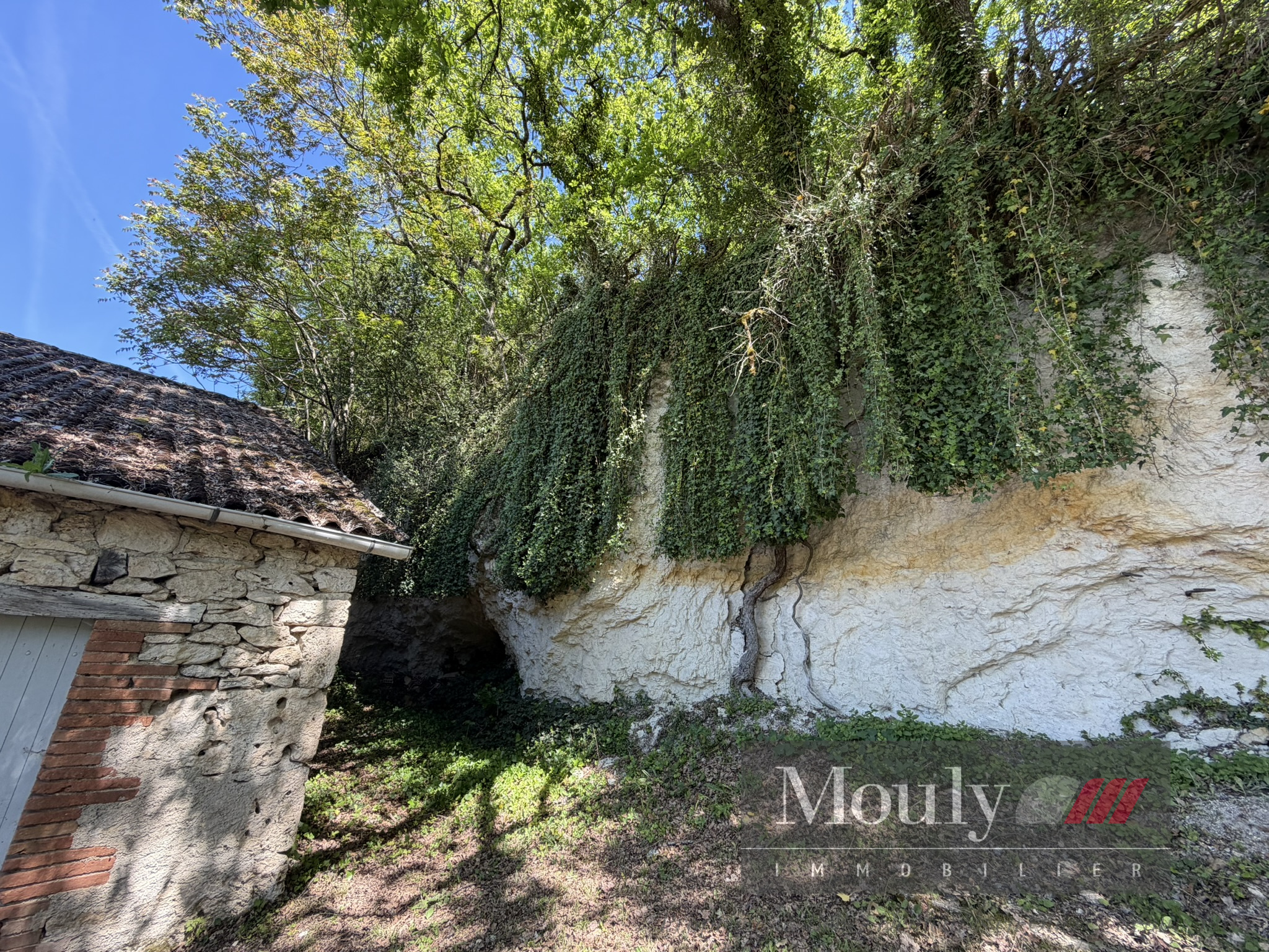 A l'extérieur, vous profitez d'un beau jardin arboré agrémenté des rocher à l'arrière côté bois avec une grotte qui confère au lieu un caractère rare et presque féerique. En plein jardin se trouve l'emplacement d'une piscine (à rénover entièrement) dominant la vallée, offrant un panorama exceptionnel.