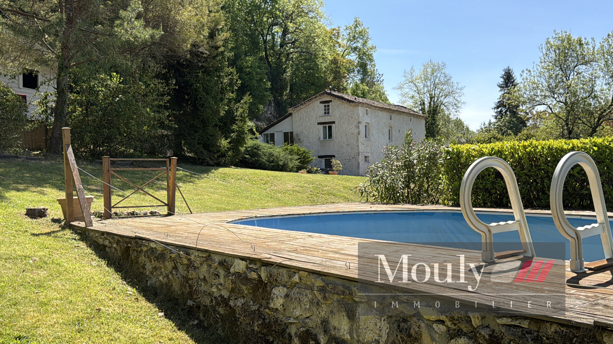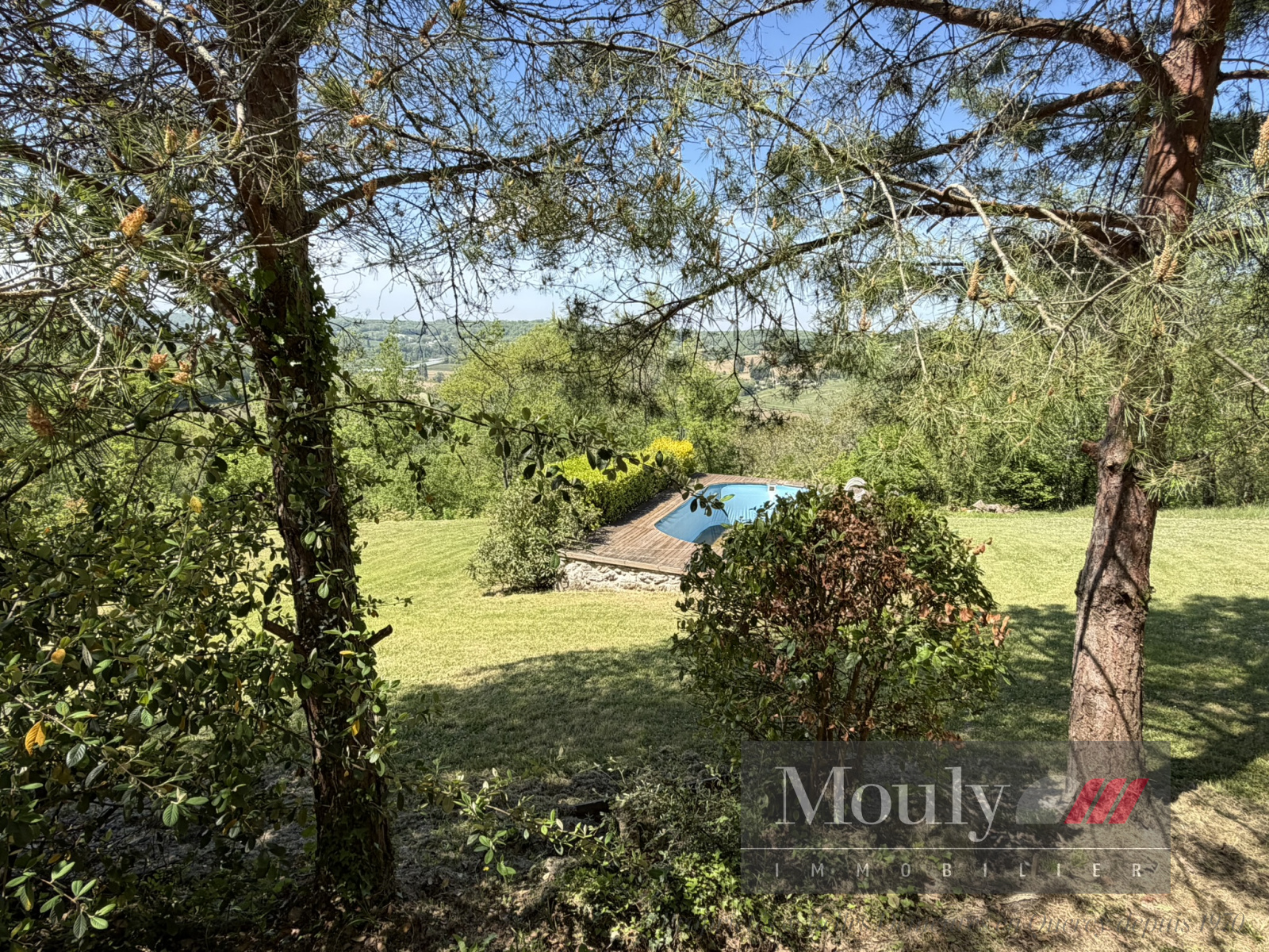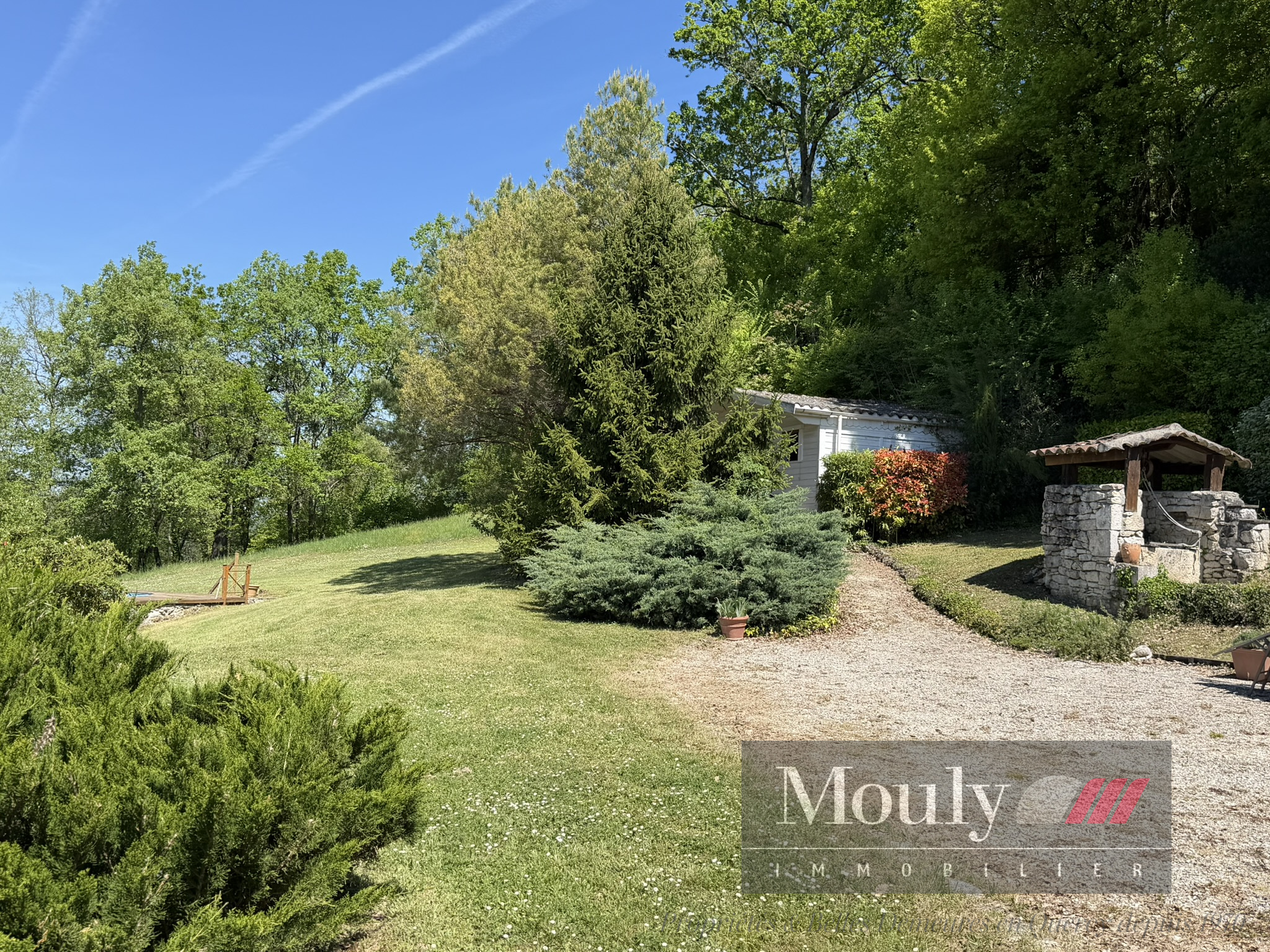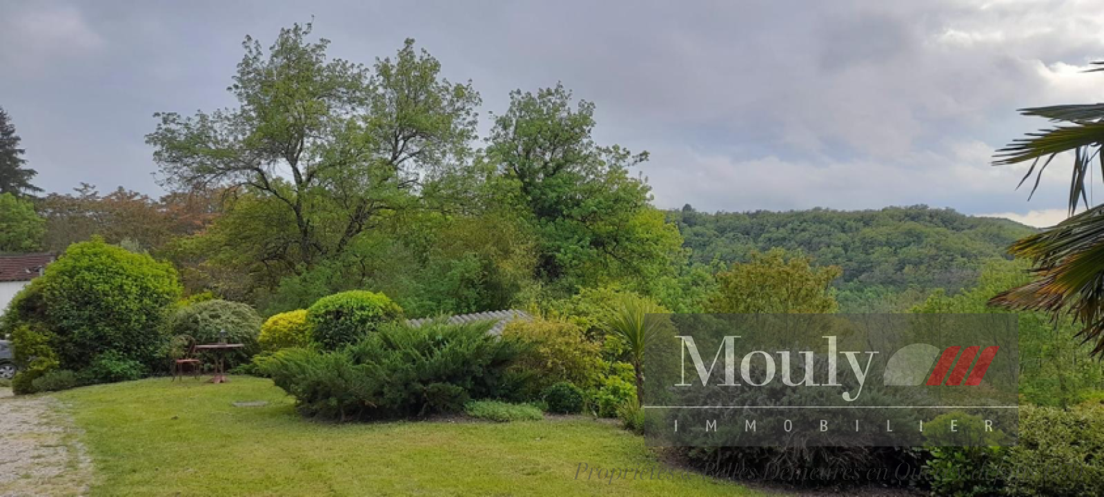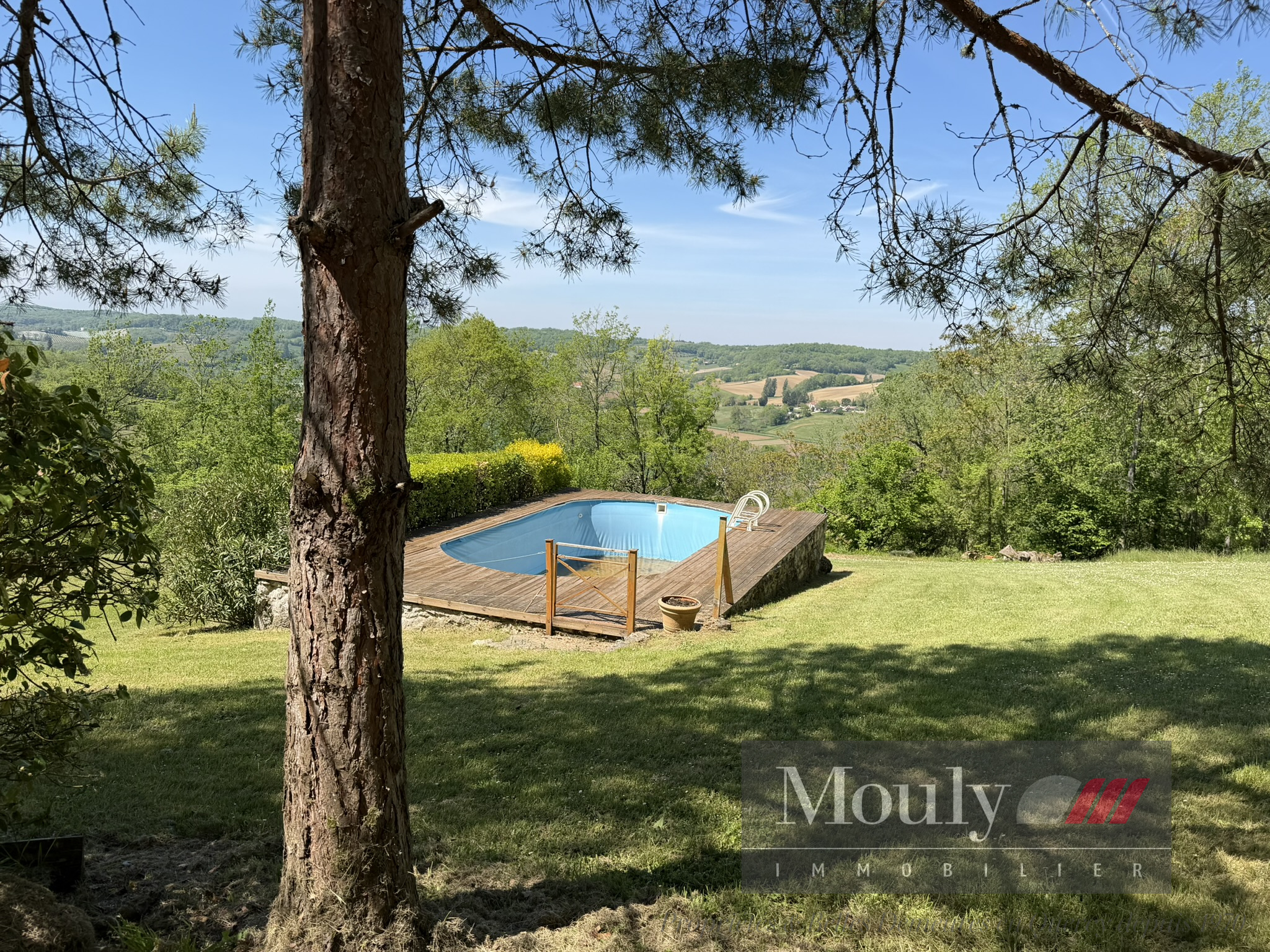 A l'extérieur, vous profitez d'un beau jardin arboré agrémenté des rocher à l'arrière côté bois avec une grotte qui confère au lieu un caractère rare et presque féerique. En plein jardin se trouve l'emplacement d'une piscine (à rénover entièrement) dominant la vallée, offrant un panorama exceptionnel.