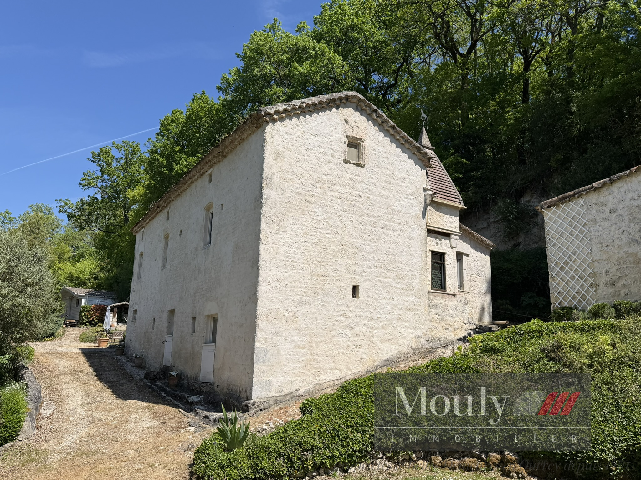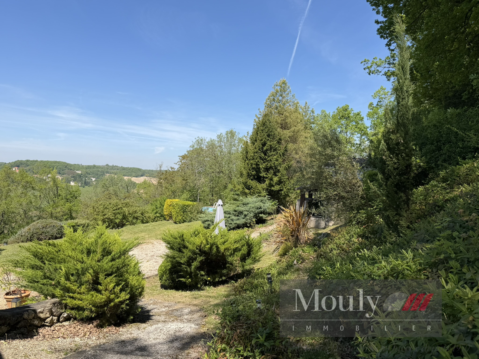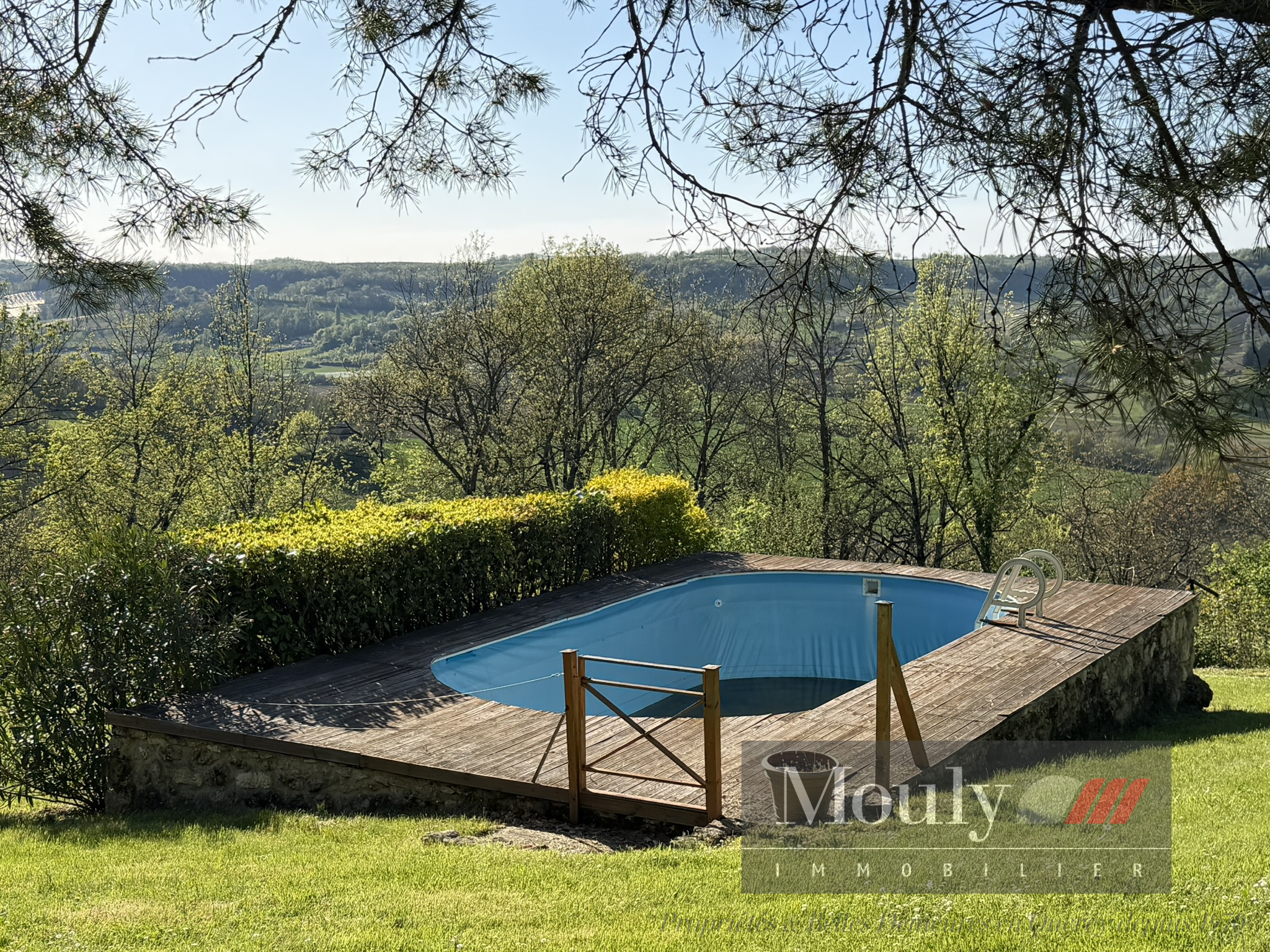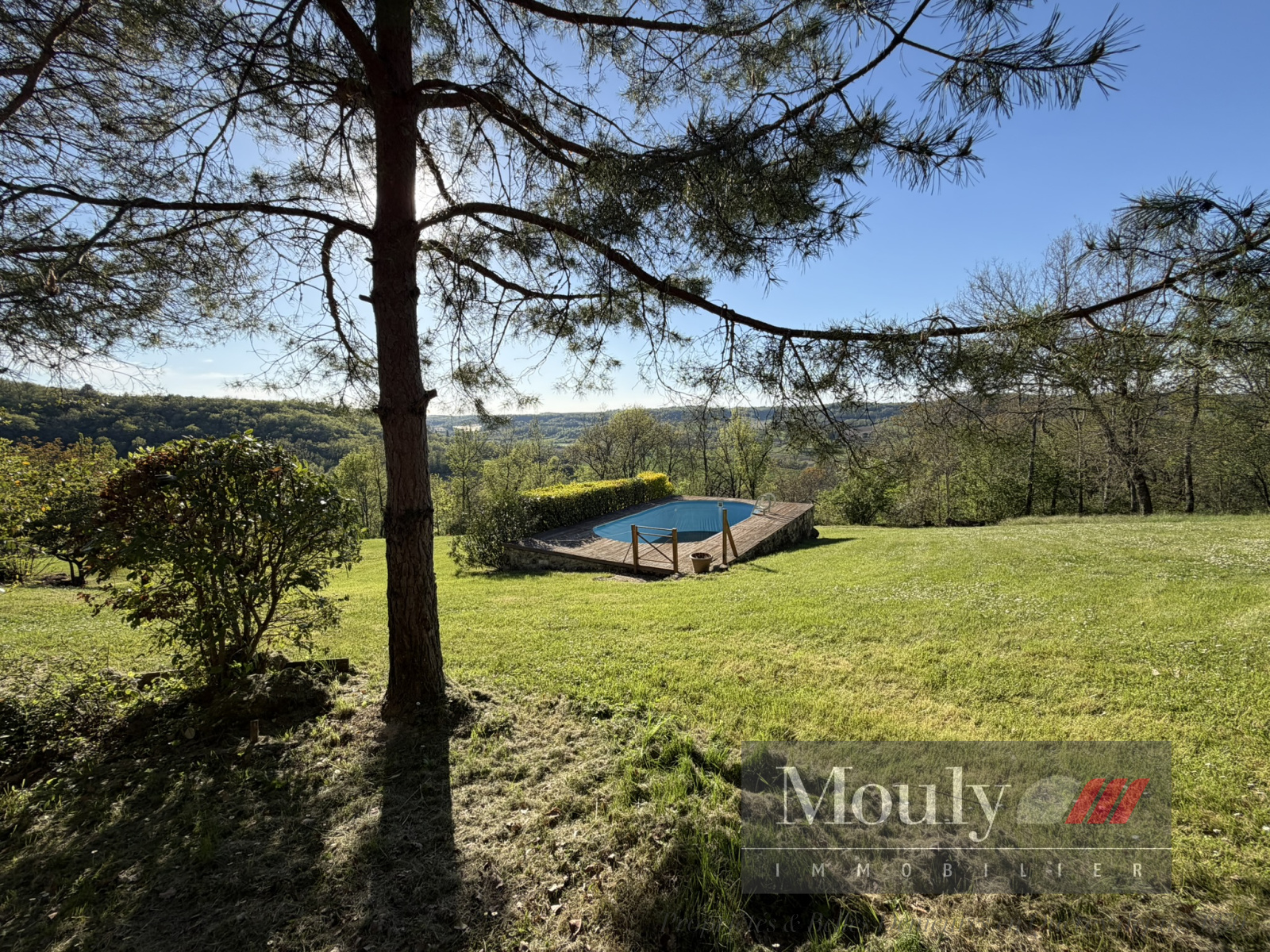 A l'extérieur, vous profitez d'un beau jardin arboré agrémenté des rocher à l'arrière côté bois avec une grotte qui confère au lieu un caractère rare et presque féerique. En plein jardin se trouve l'emplacement d'une piscine (à rénover entièrement) dominant la vallée, offrant un panorama exceptionnel.
