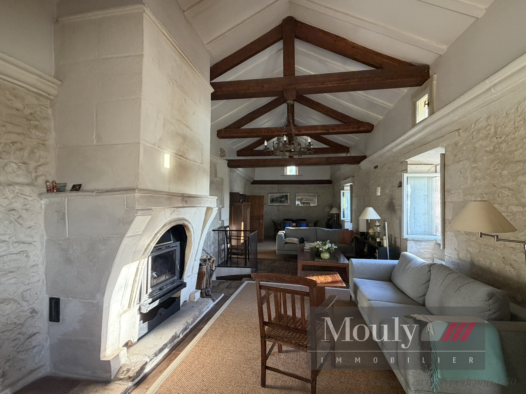 Espace de vie ouvert avec cheminée centrale comprenant un salon, un espace salle à manger et une cuisine ouverte, ainsi qu'une cuisine d'été complète au rez-de-chaussée donnant directement sur la terrasse. Une véranda offre un espace de détente supplémentaire attenant à la terrasse.