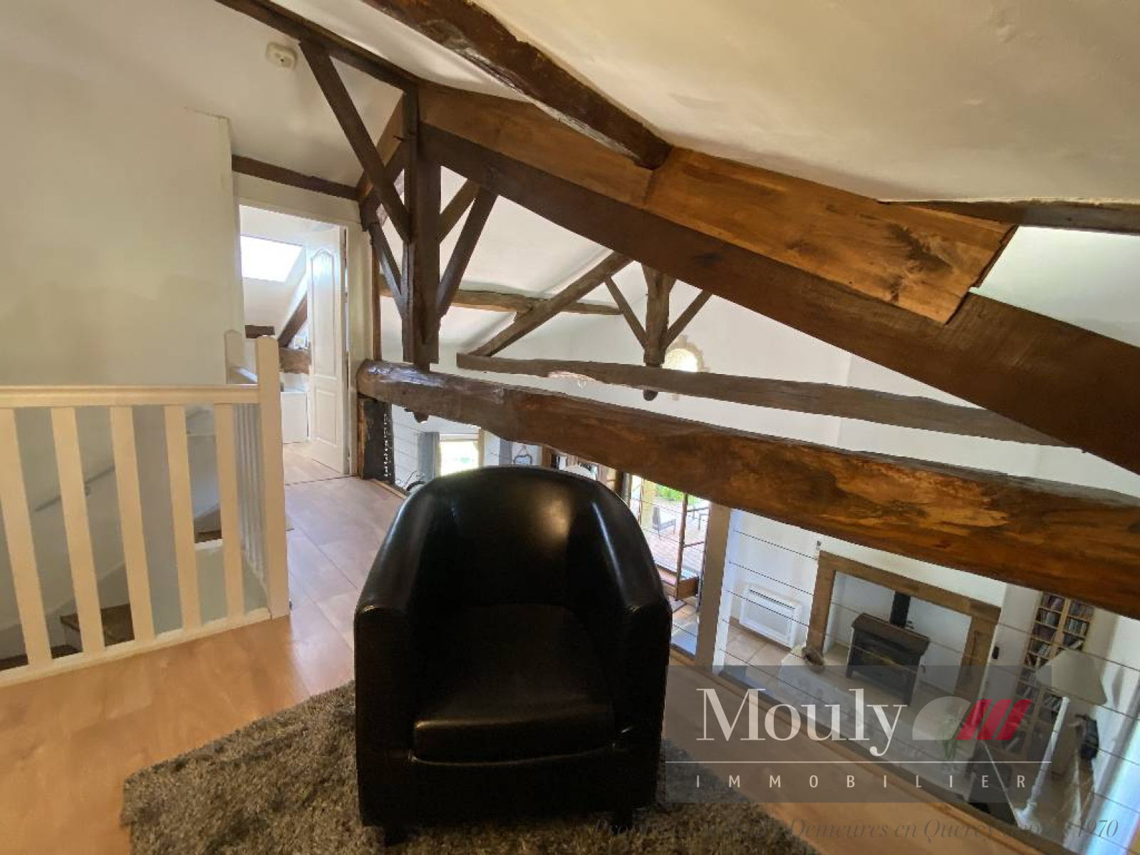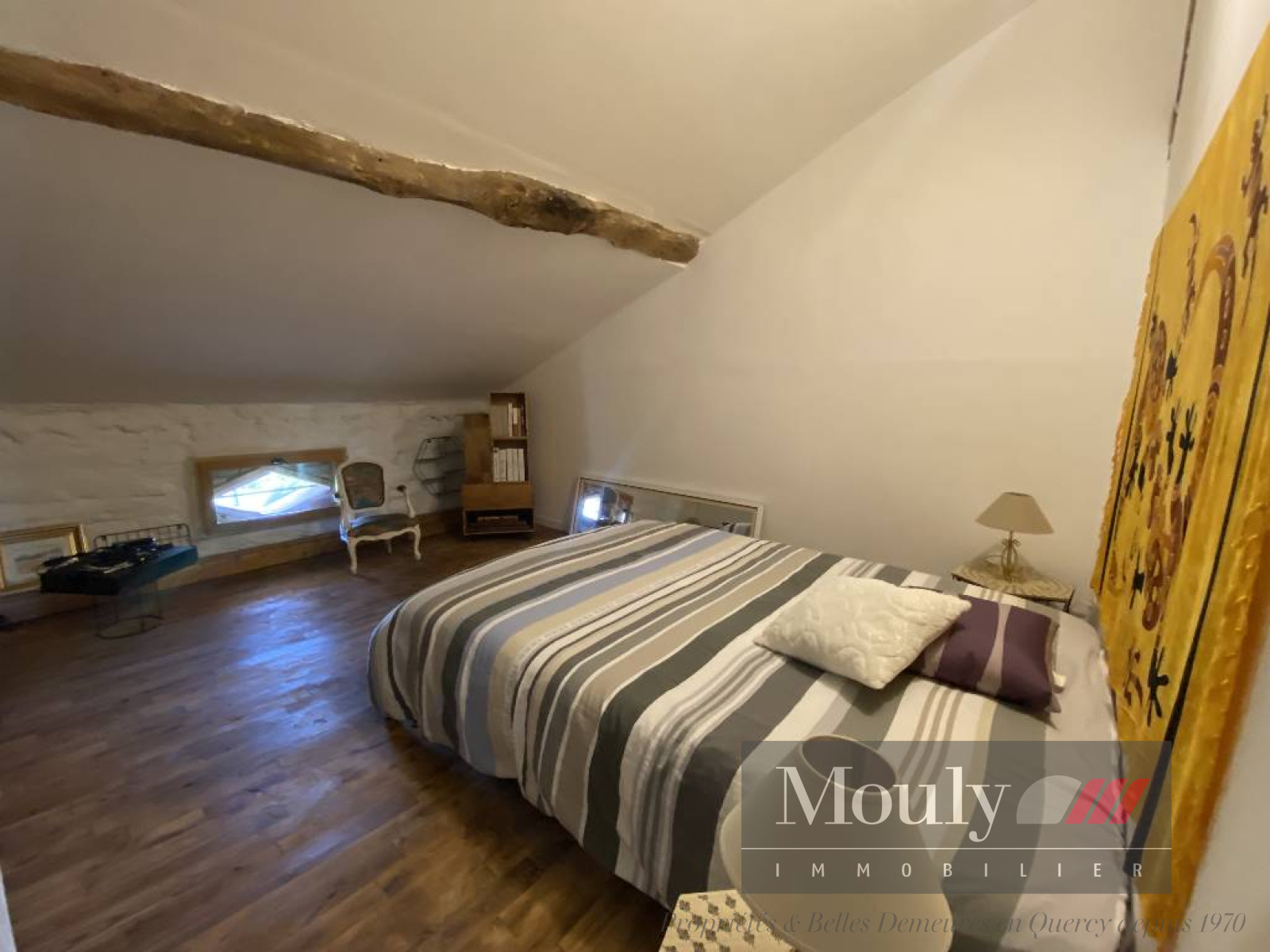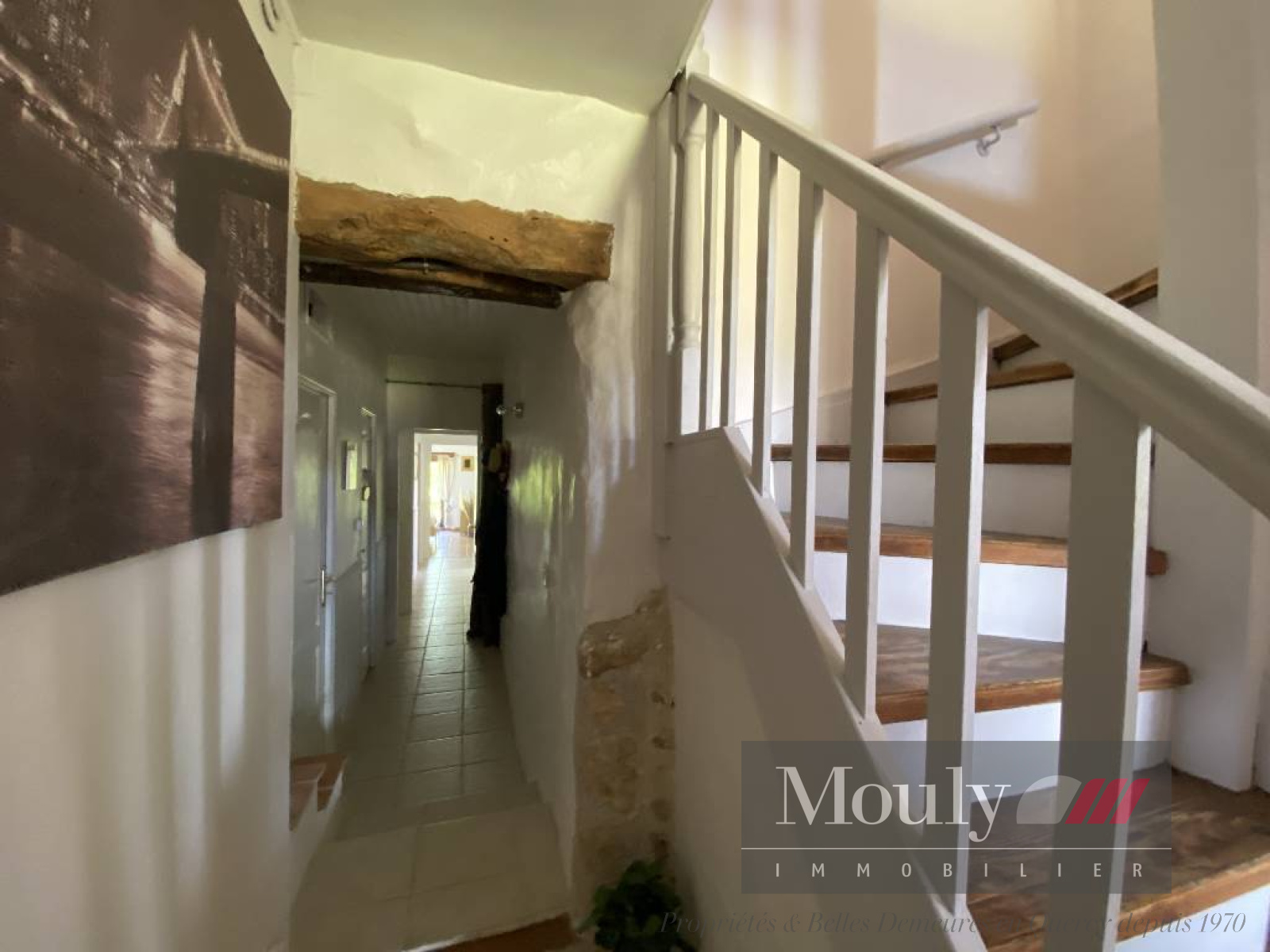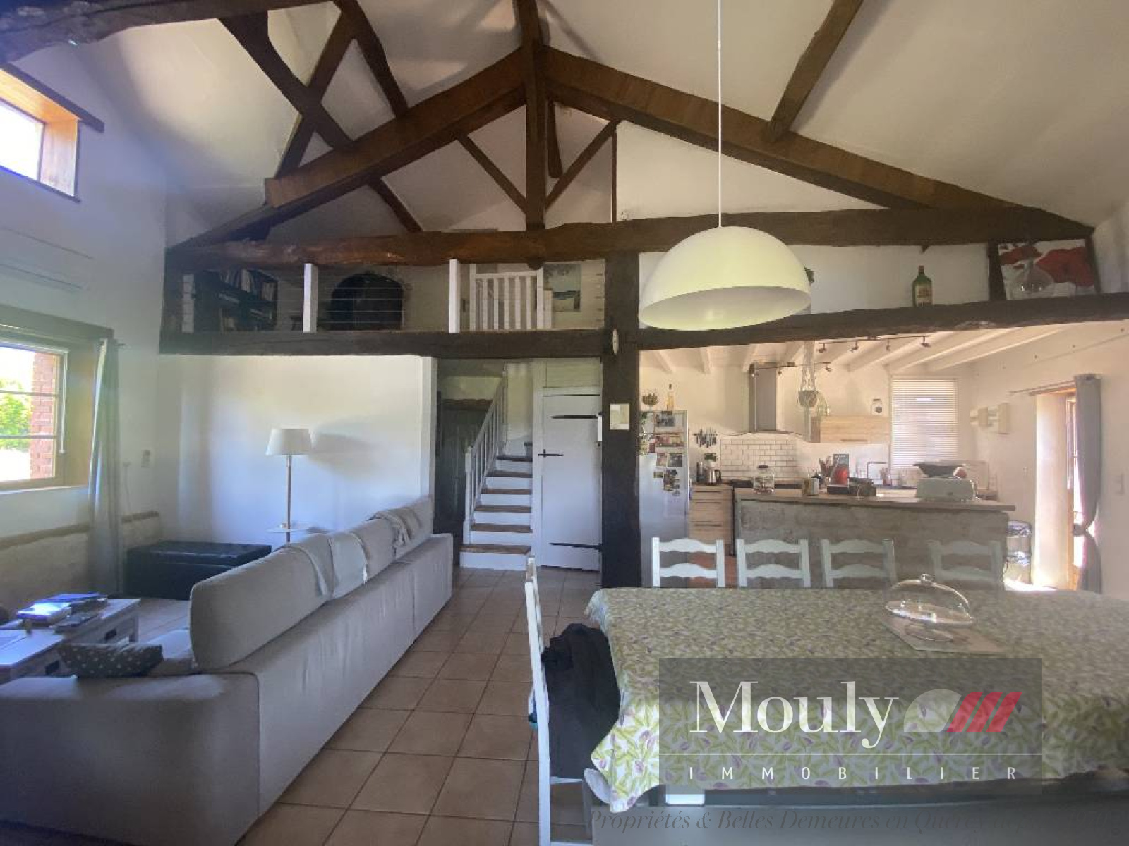 Nombreux éléments authentiques préservés (poutres apparentes et murs en pierre blanche).