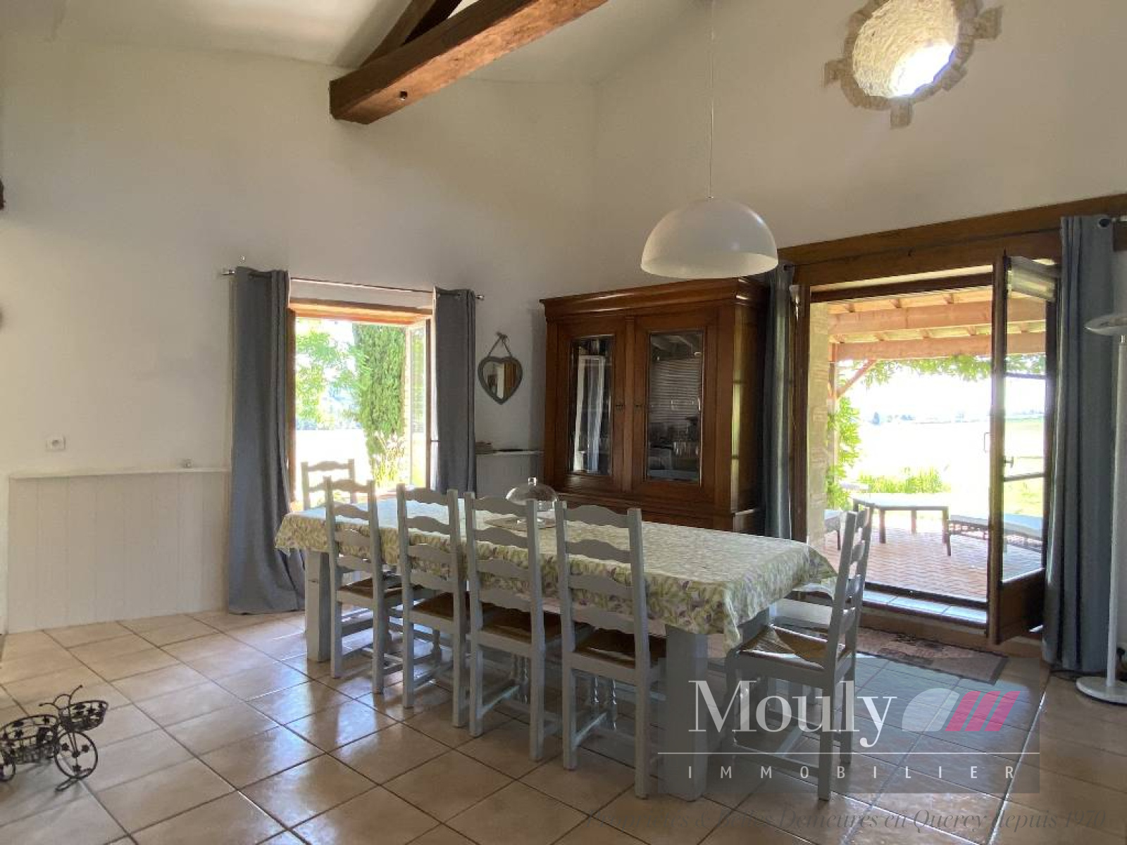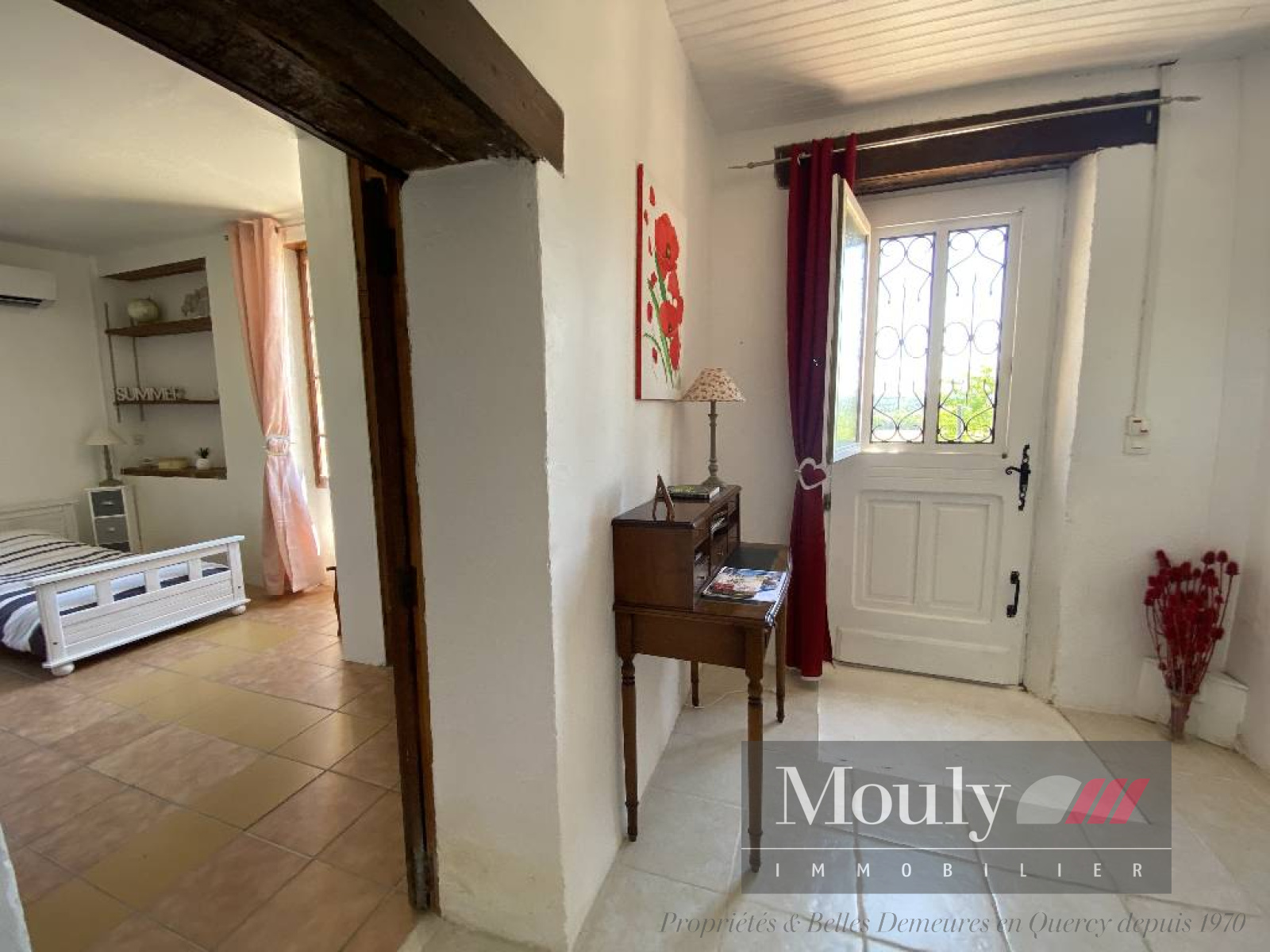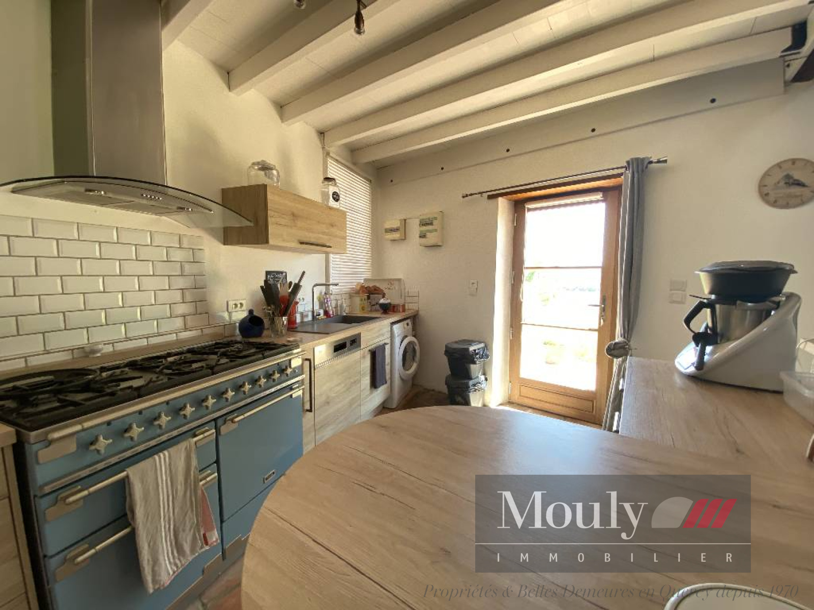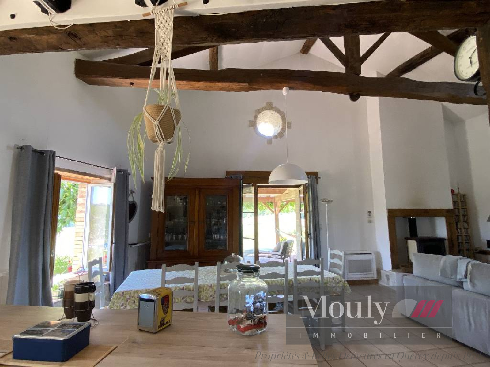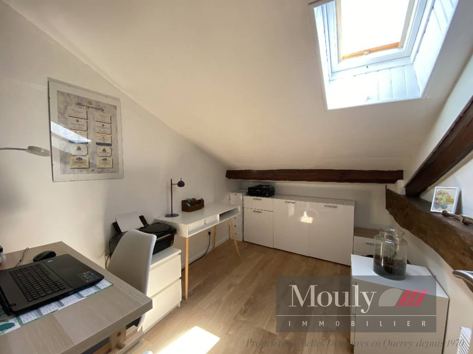 Nombreux éléments authentiques préservés (poutres apparentes et murs en pierre blanche).