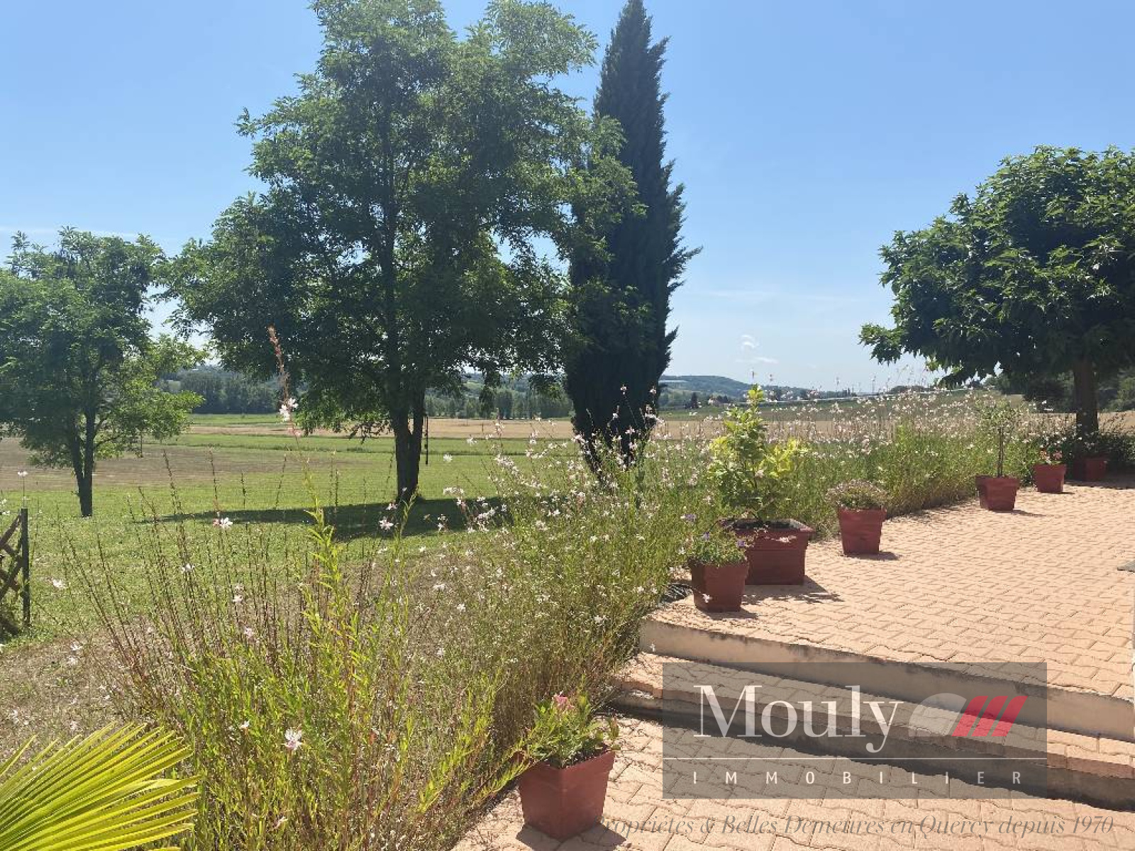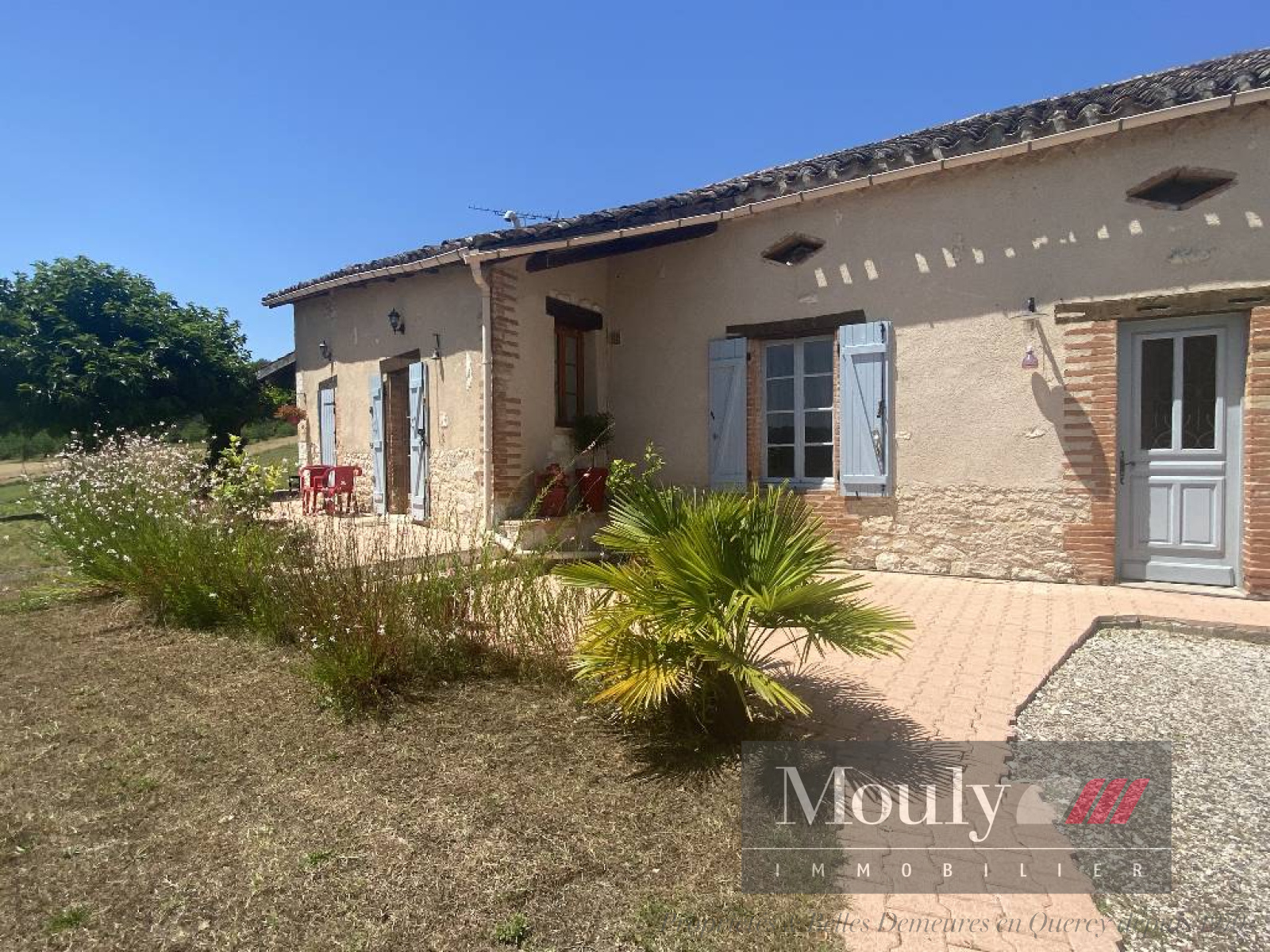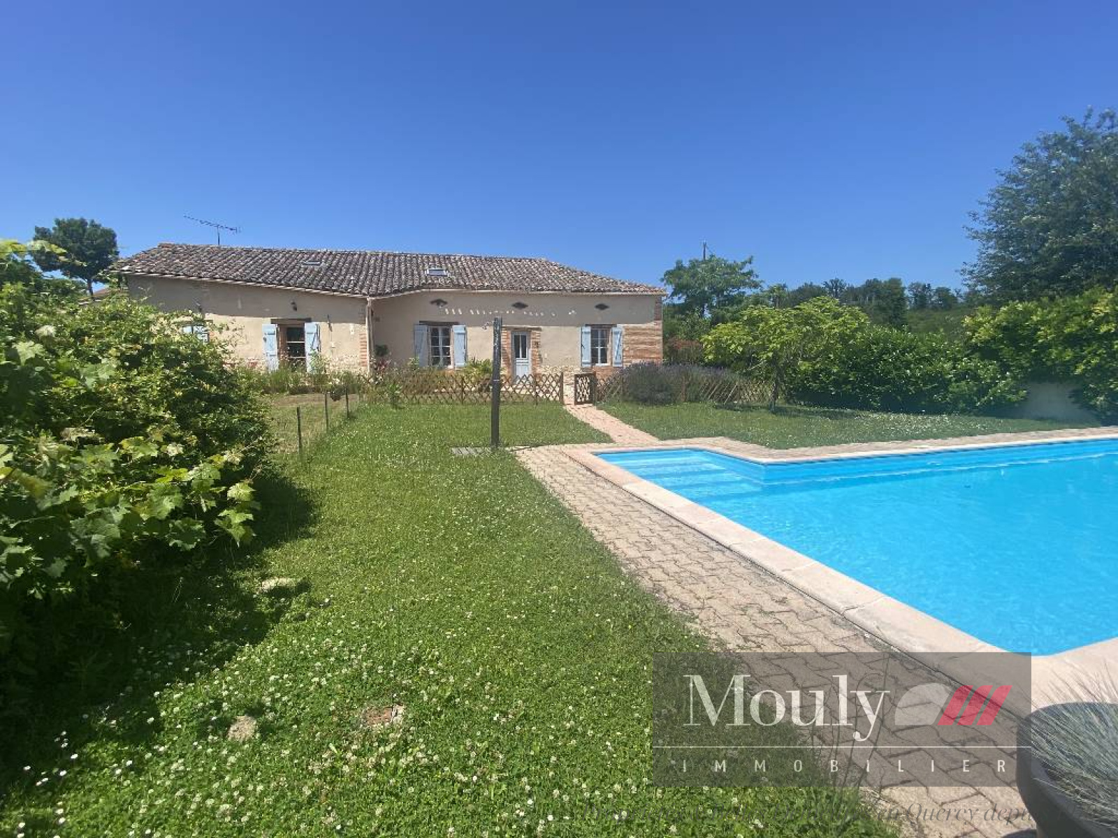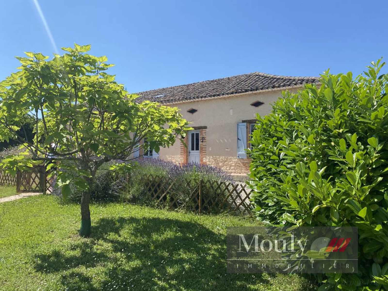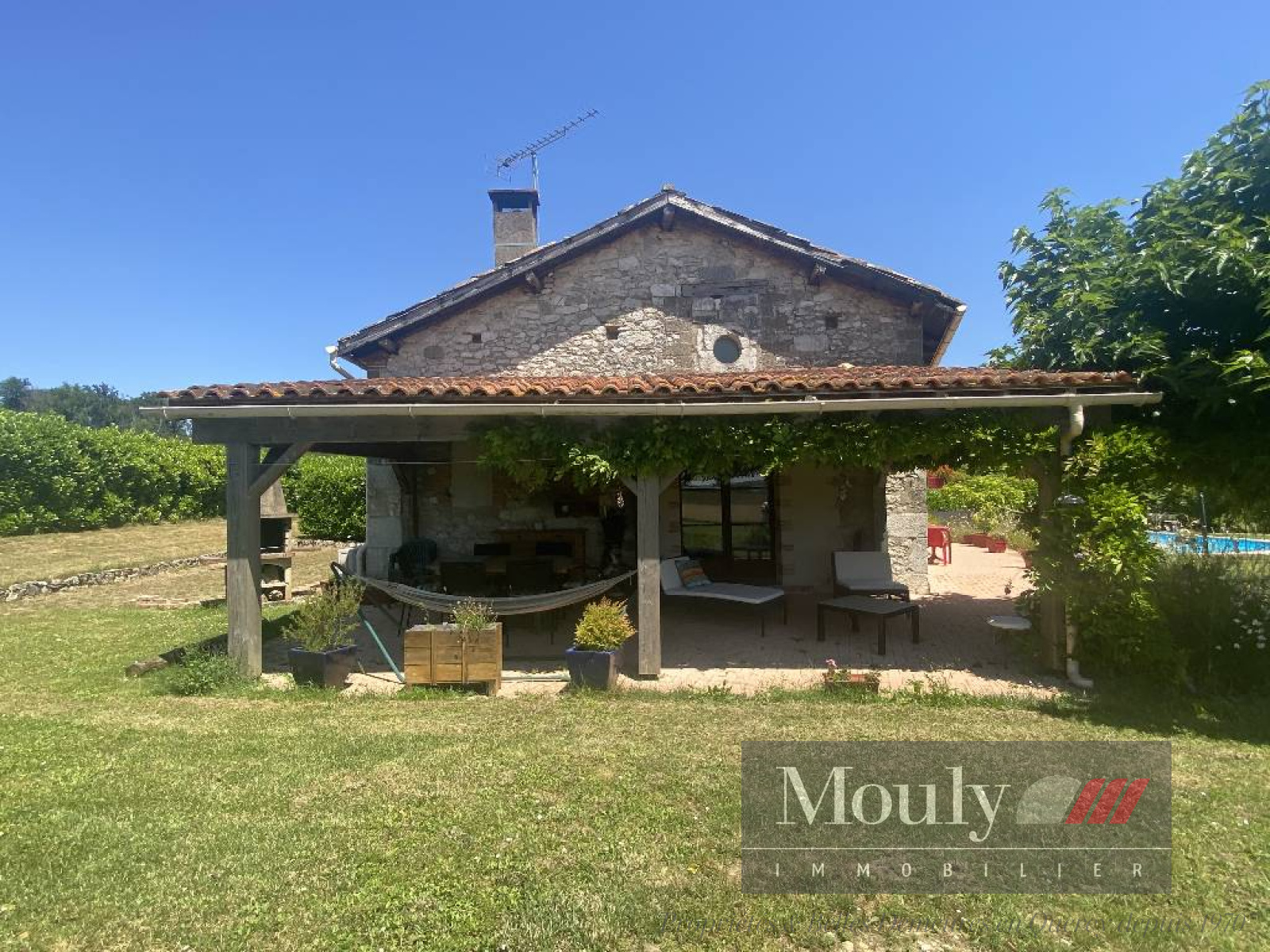 À l'arrière de la maison une terrasse couverte avec barbecue et un terrain de pétanque. Séparé de la maison, un garage de 40 m².