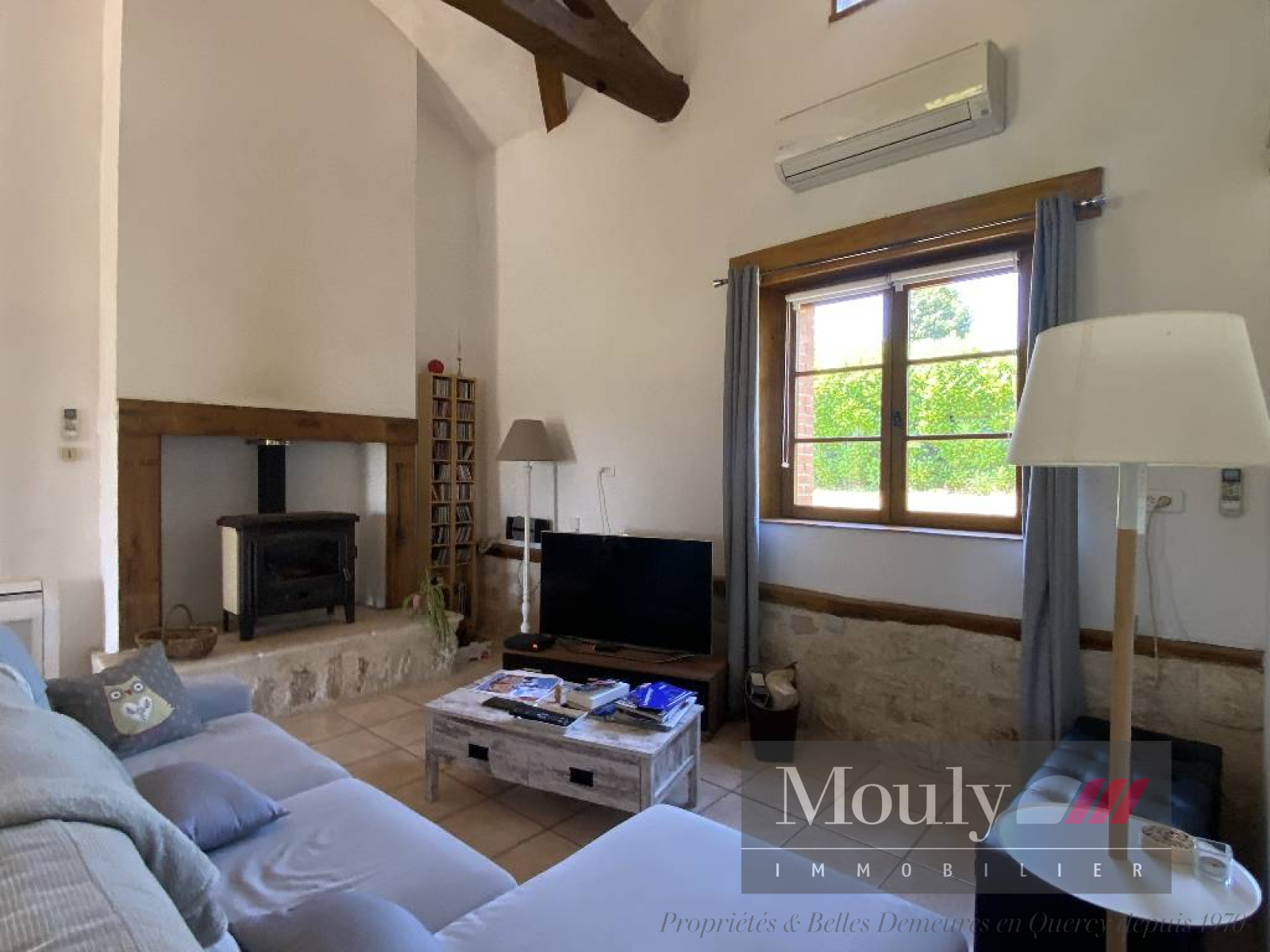 Chauffage pompe à chaleur, climatisations réversibles dans toutes les pièces et poêle à bois dans le salon